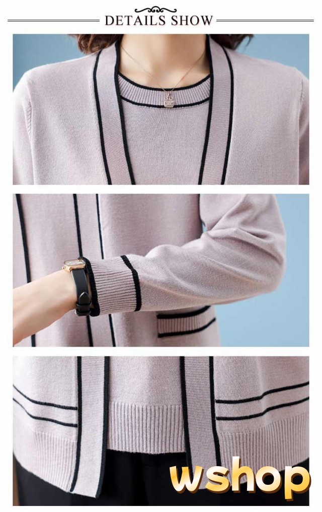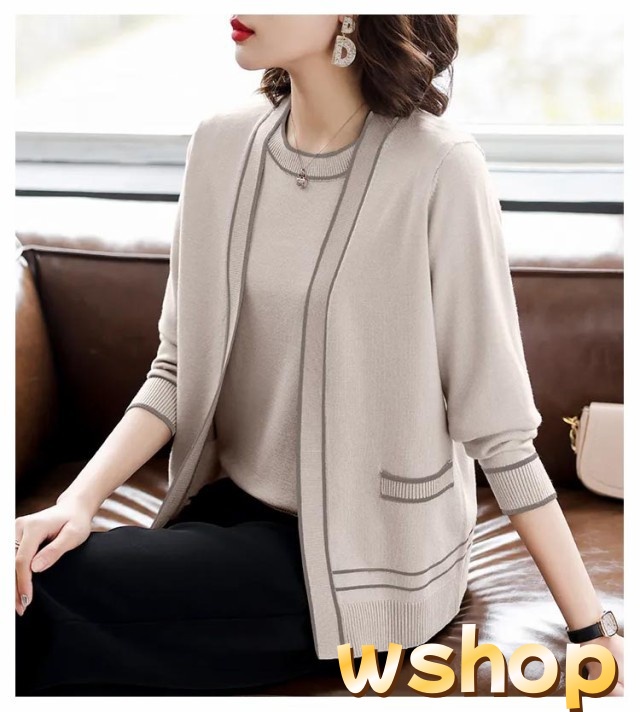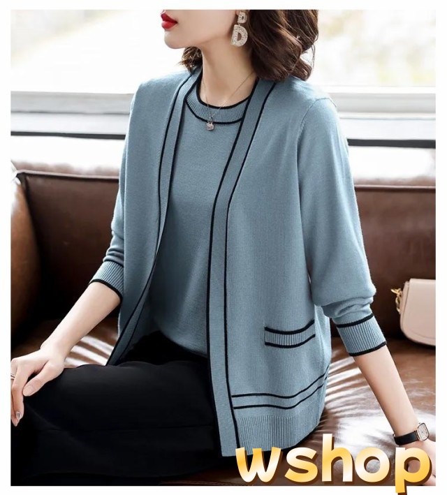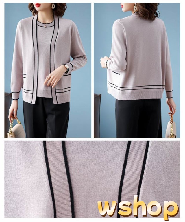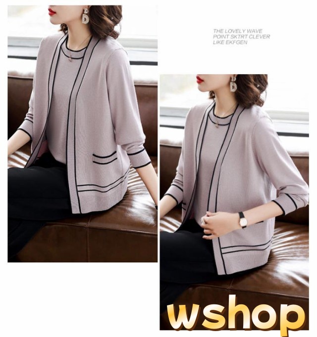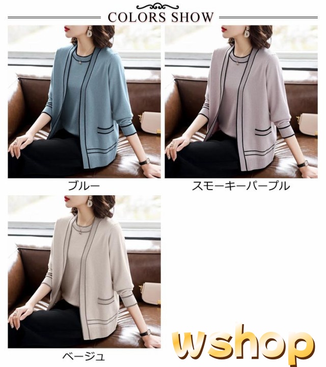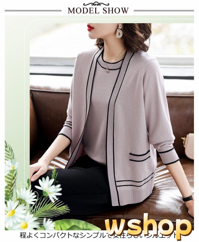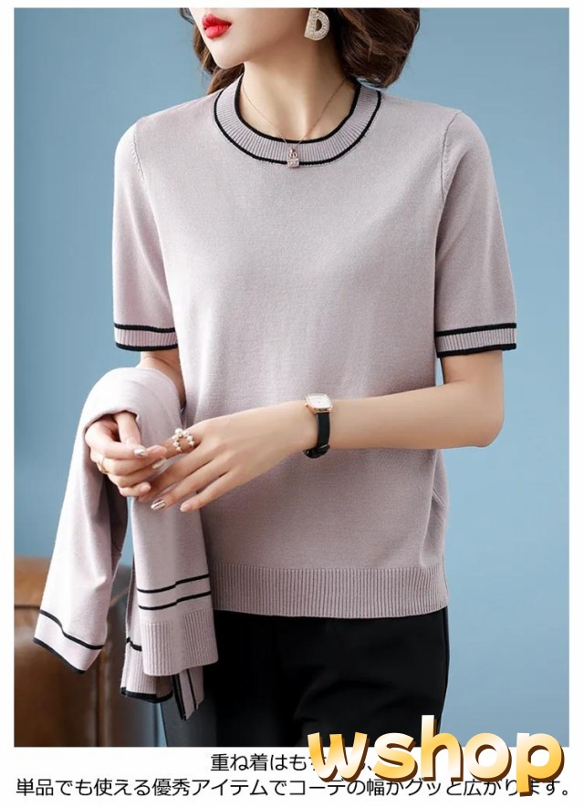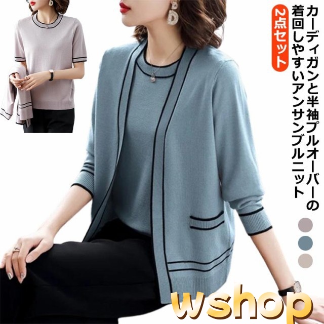 話題商品 レビュー高評価 丸首 カーディガン セーター 婦人 【wshop アンサンブル 通勤 】半袖 2点セット クルーネック カジュアル オフィス トップス アウター 上品 ライン入り 上着 ニット プレゼント 母の日 きれいめ 送料無料