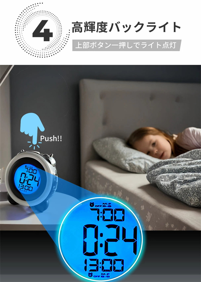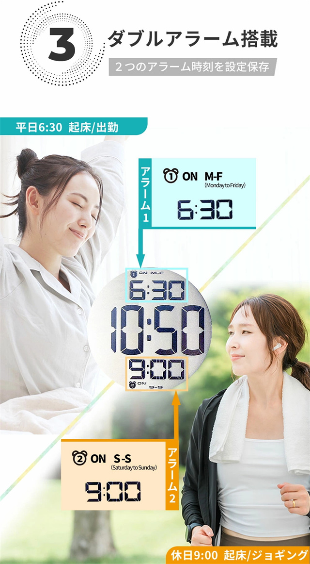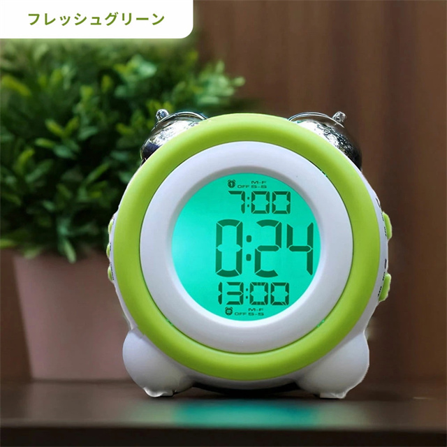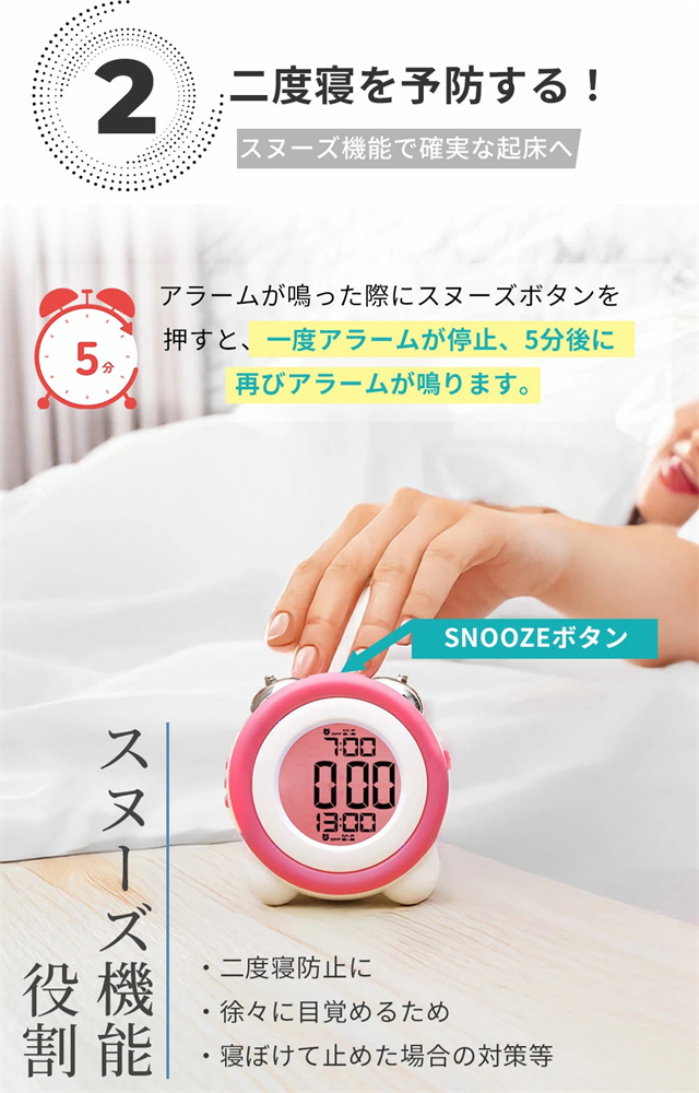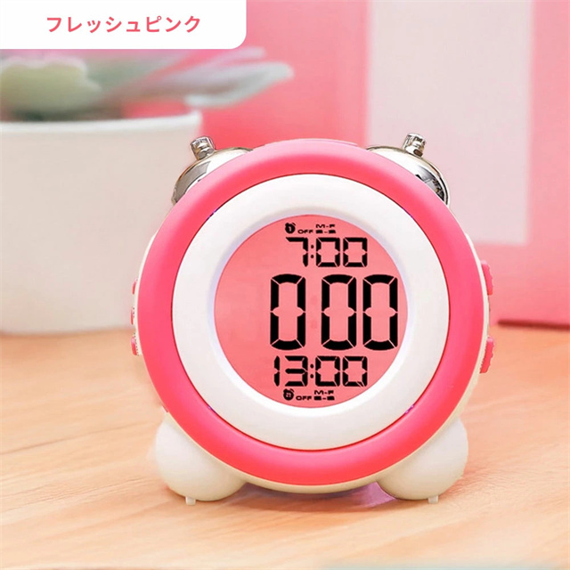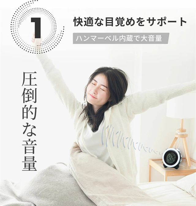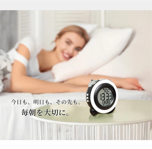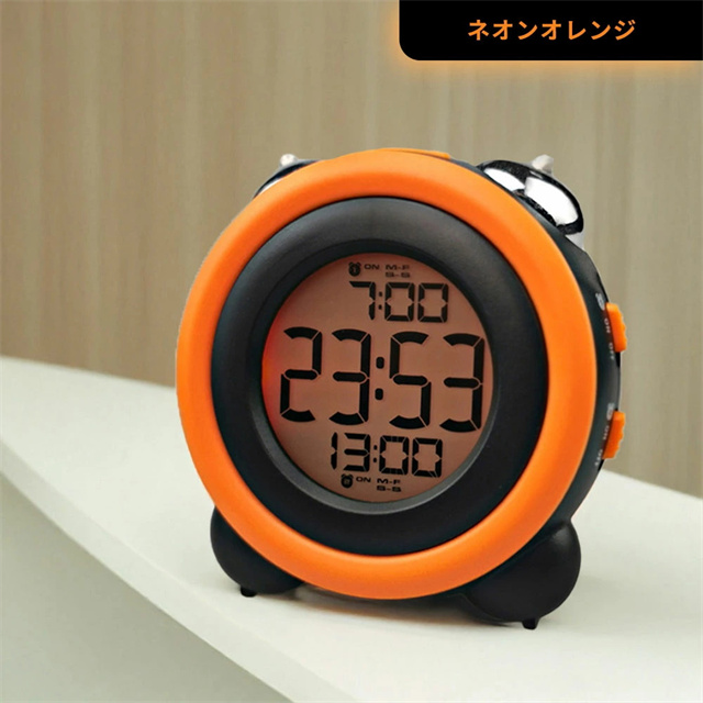 特徴1 【高精度な目覚めをサポート】 目覚めをしっかりサポートするデジタルアラームクロック。大型ディスプレイで視認性が高く、見やすいデザインです。朝が苦手な方でも安心して使える、快適な目覚めを提供します。 特徴2 【二度寝を防止するスヌーズ機能】 スヌーズ機能付きで、一度アラームを止めても再度鳴るので二度寝を防止します。忙しい朝も時間をしっかり管理し、安心して目覚められる便利な機能を搭載しています。 特徴3【ダブルアラーム機能搭載】 2つの異なるアラームをセットできるダブルアラーム機能を搭載。仕事の日と休日で異なる時間にアラームを設定することも可能なので、ライフスタイルに合わせて柔軟に使えます。 特徴4 【高輝度バックライト】 暗闇でもしっかりと見やすい高輝度バックライト搭載。夜間の時間確認もスムーズにでき、便利なナイトモードとしても活躍します。 特徴5 【おしゃれなデザイン&豊富なカラーバリエーション】 スタイリッシュな円形デザインで、インテリアにも馴染むデジタルアラームクロック。カラーバリエーションが豊富で、お部屋の雰囲気に合わせた選択が可能です。 |