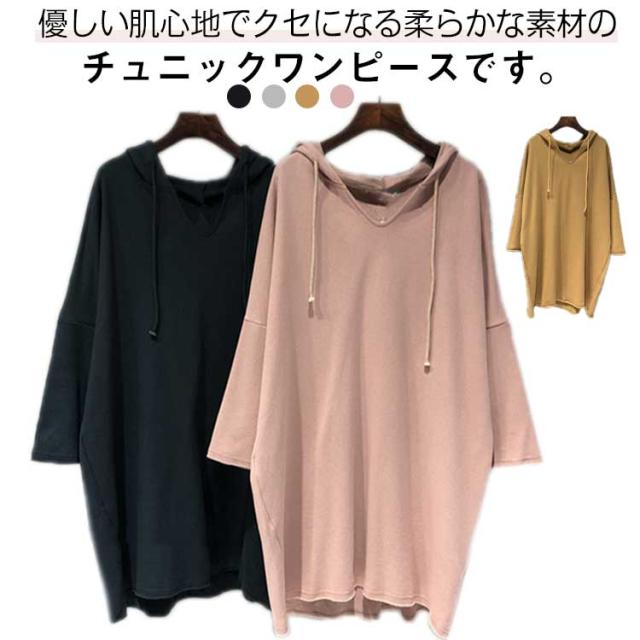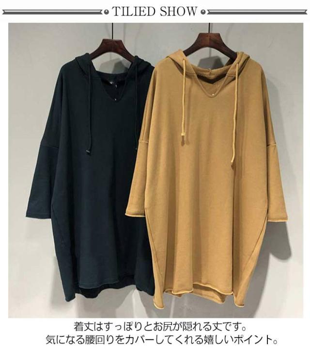レディース 長袖 春秋 パーカー チュニックパーカー フード付き ワンピース プルオーバー チュニック 薄手 カットソー ゆる袖 ゆったり 大きなサイズ チュニックパーカー 体型カバー ナチュラル