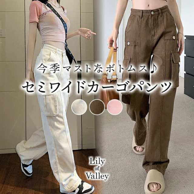 セミワイド カーゴパンツ ハイウエスト ボトムス ストレート カジュアル 無地 きれいめ / レディース ワイド パンツ ジョガーパンツ ポケット 美脚 ゆったり ワイドパンツ 大きいサイズ オフィス 韓国 着痩せ 茶色 白 ピンク ホワイト ブラウン 秋冬 春夏