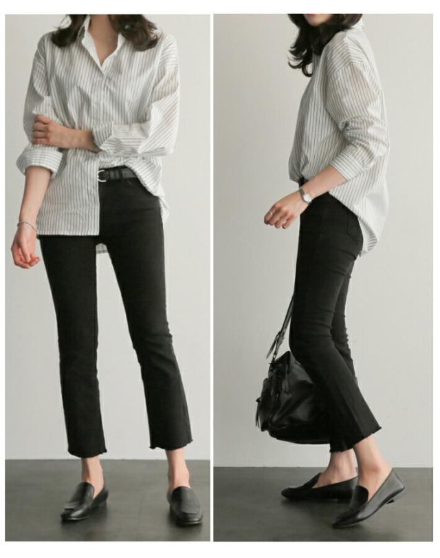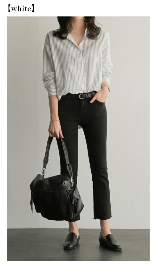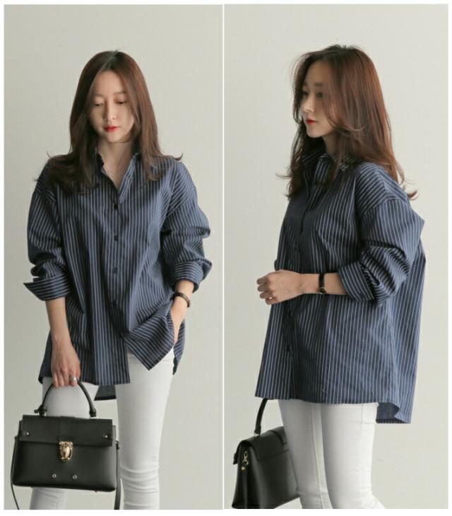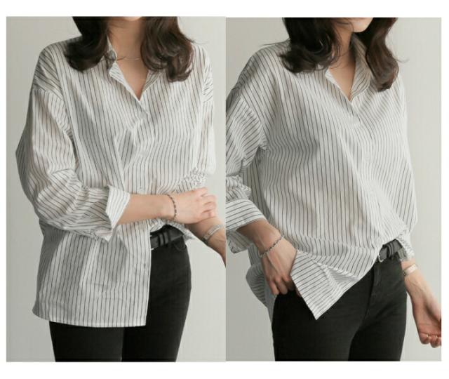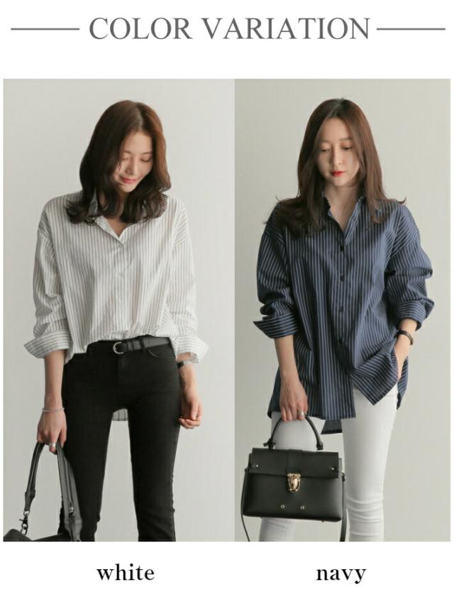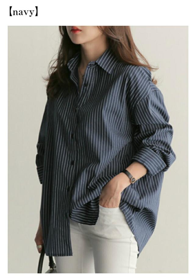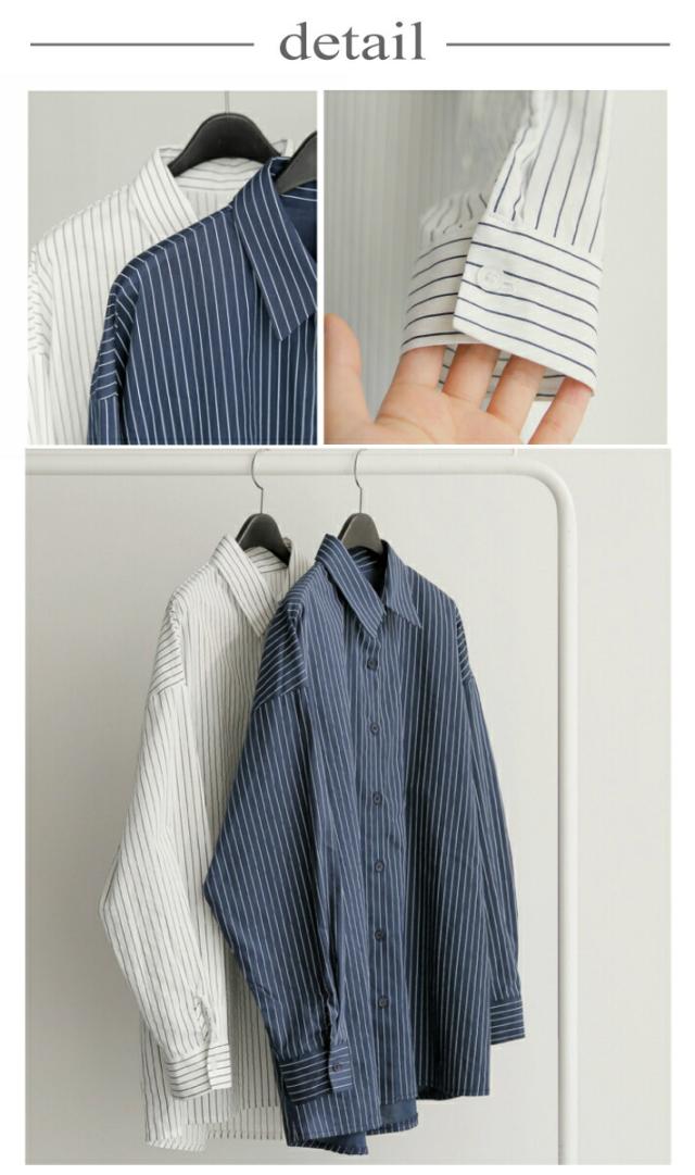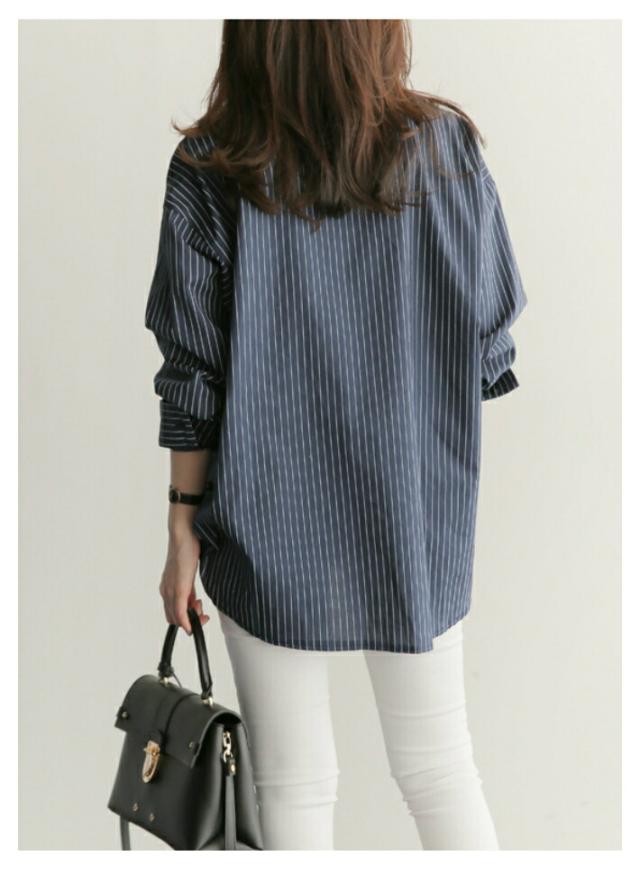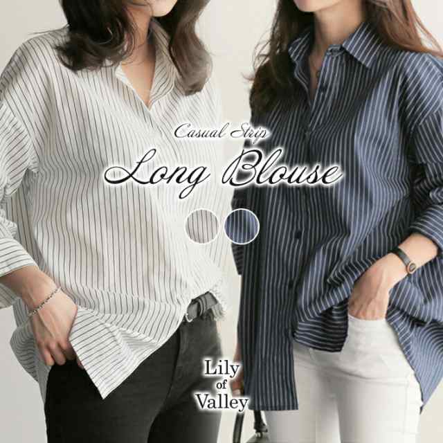 オーバーサイズ ストライプ ロング 長袖 シャツ カジュアル ゆったり ふんわり 襟付き / レディース トップス ブラウス ロングブラウス ロング丈 ストライプシャツ チュニック フレア チュニック丈 ドロップショルダー 春 夏 秋 薄手 青 白 ホワイト ブルー