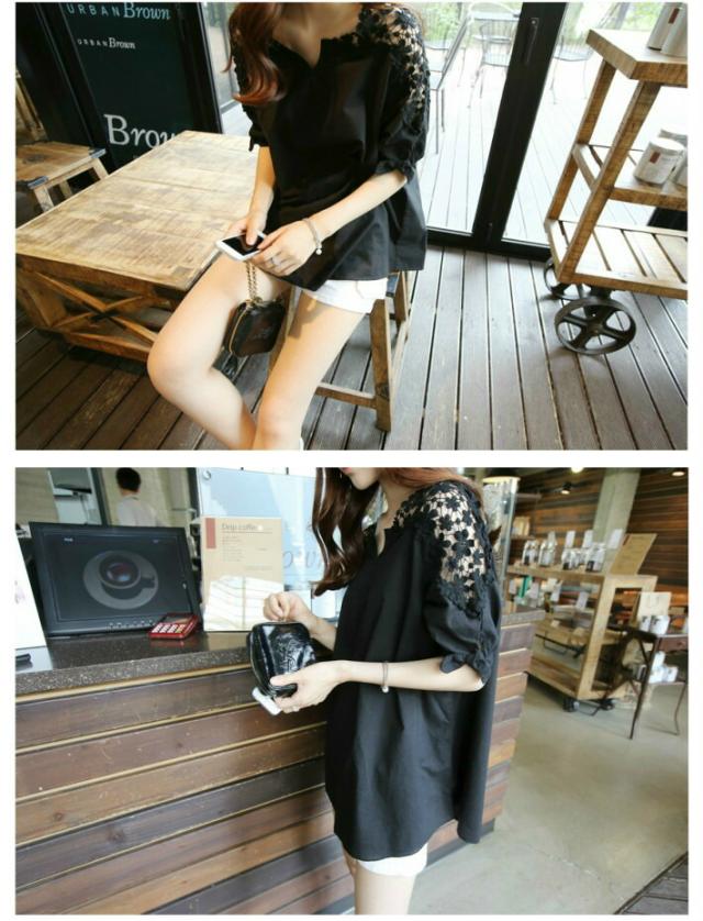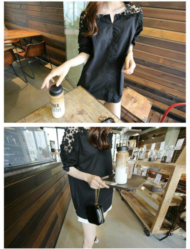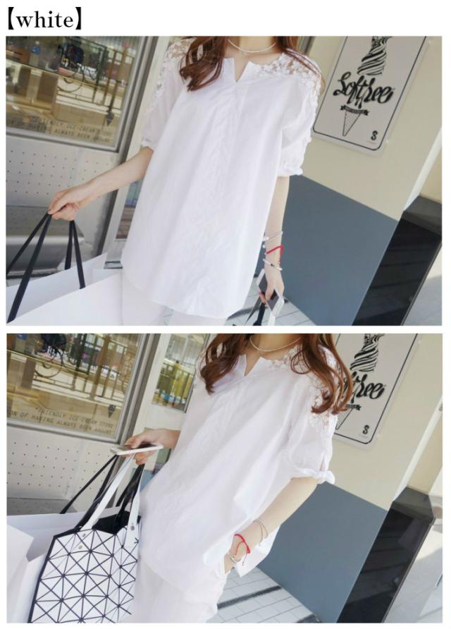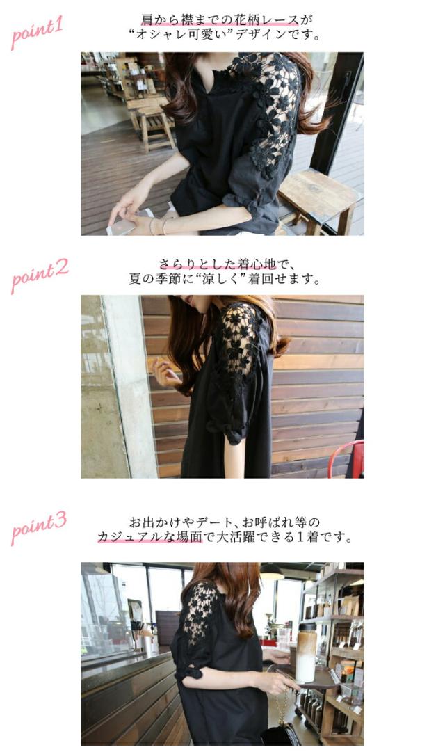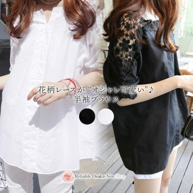 花柄 レース 刺繍 ブラウス 半袖 ノーカラー シャツ / フラワー 花 柄 小花柄 チュニック レディース トップス カットソー 透け ロング ロング丈 大きいサイズ Vネック 抜き襟 スキッパー 肩出し 肩だし 肩みせ 夏 白 ホワイト 黒 ブラック 春夏 春 夏