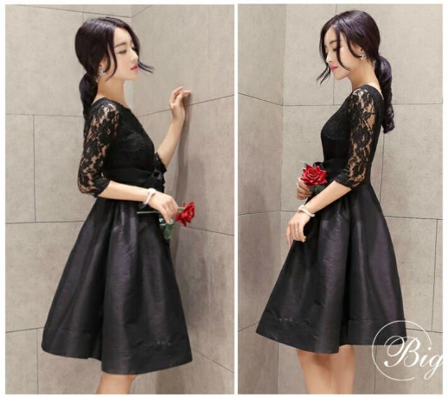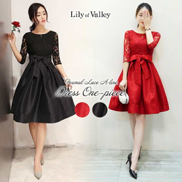 ワンピース きれいめ フォーマル 総レース ドレス 上品 ハイウエスト リボン / パーティードレス レース Aライン フレア スカート 花柄 刺繍 サテン ひざ丈 膝丈 半袖 シースルー パーティー 結婚式 二次会 入学式 卒業式 演奏会 黒 ブラック 赤 レッド