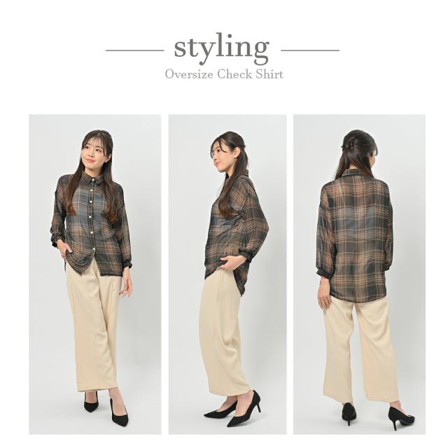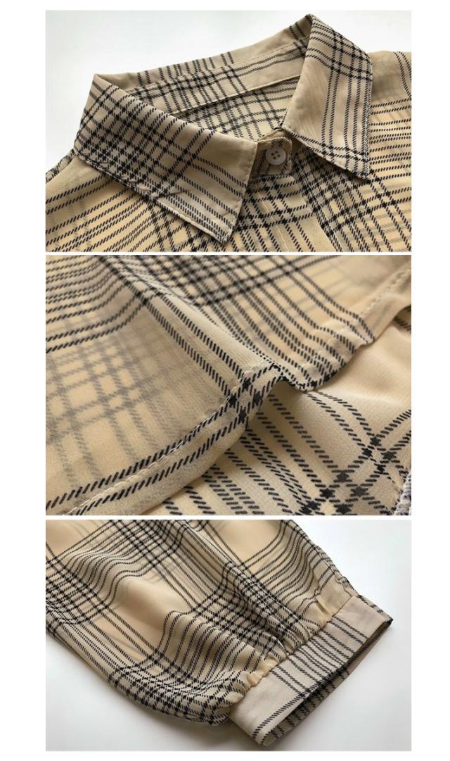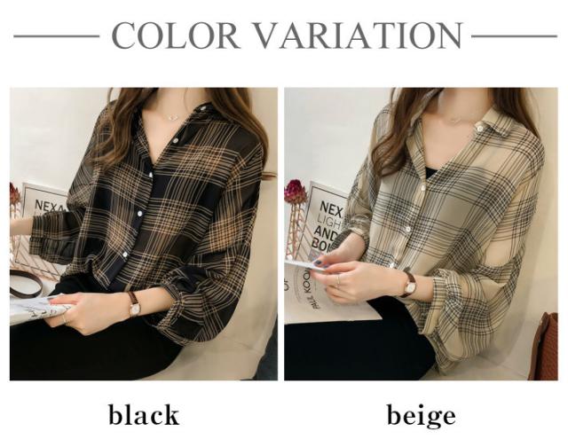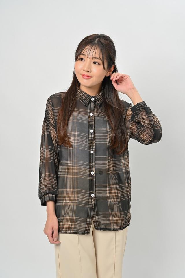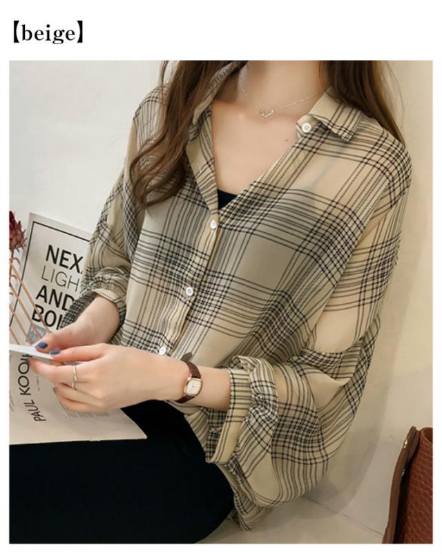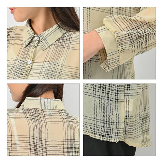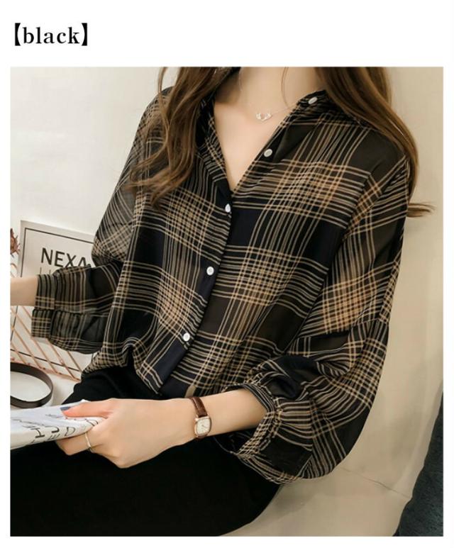 ボリュームスリーブ チェック シフォン ブラウス レディース トップス 長袖 / ロング シースルー 柄 ボリューム袖 チェック柄 チェックシャツ 襟付き 抜き襟 とろみシャツ カジュアル 清楚 秋 春 夏 春夏 大きいサイズ 薄手 黒 ベージュ カーキ ブラック