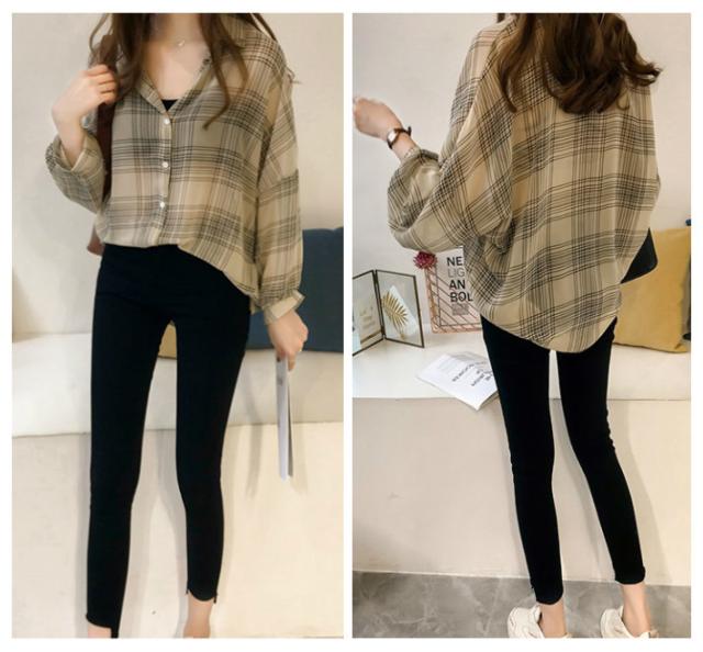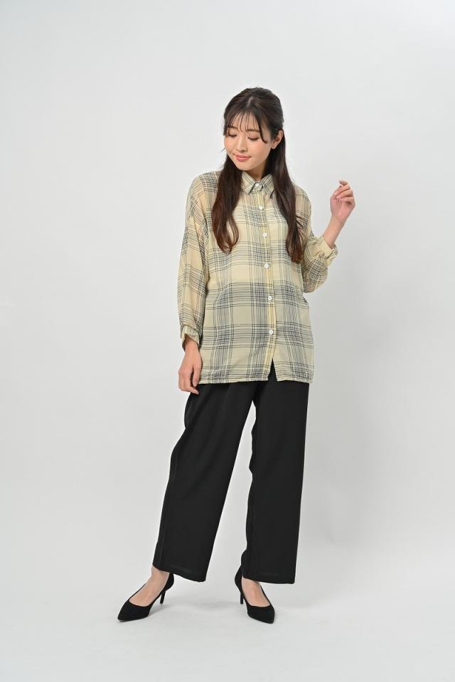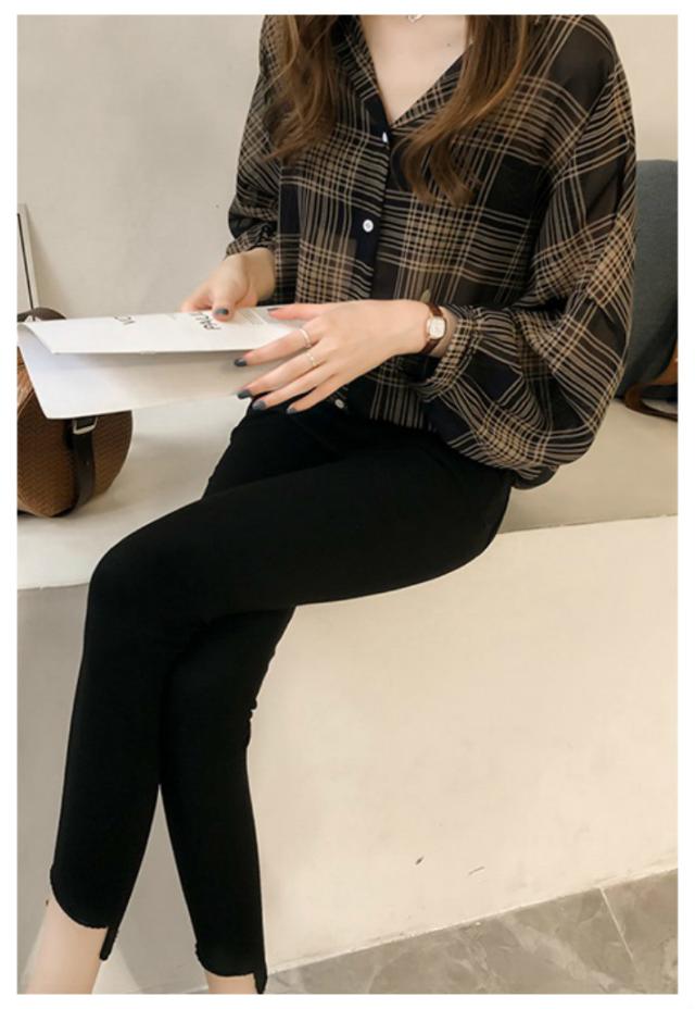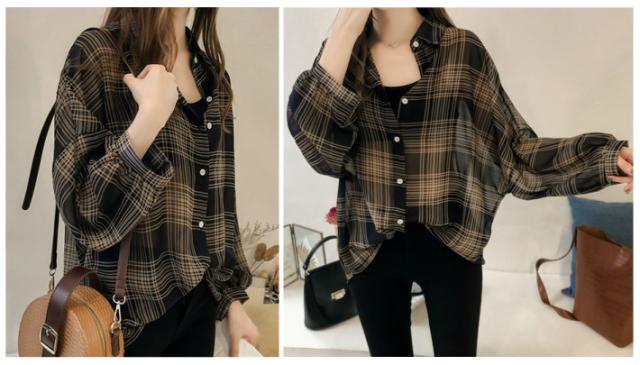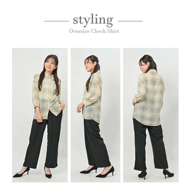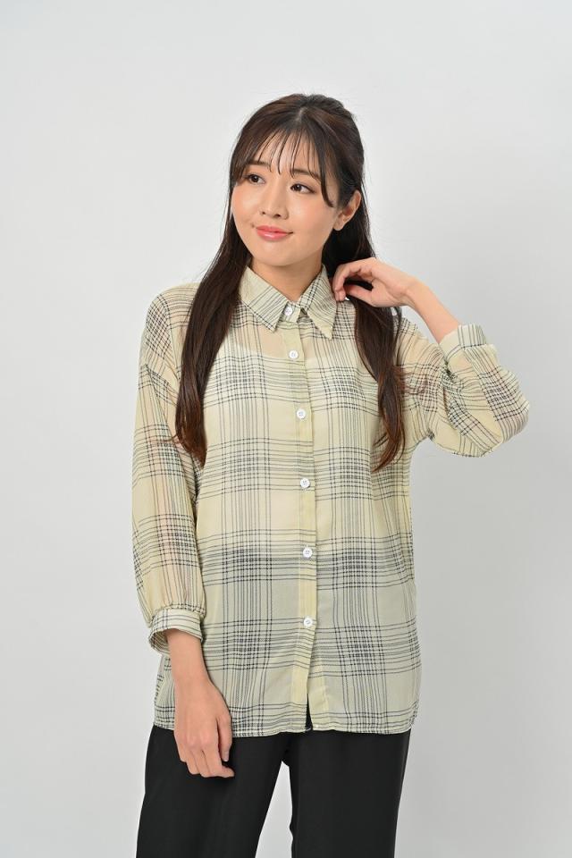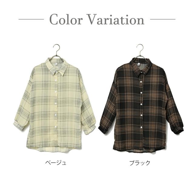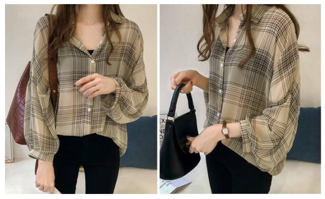 ボリュームスリーブ チェック シフォン ブラウス レディース トップス 長袖 / ロング シースルー 柄 ボリューム袖 チェック柄 チェックシャツ 襟付き 抜き襟 とろみシャツ カジュアル 清楚 秋 春 夏 春夏 大きいサイズ 薄手 黒 ベージュ カーキ ブラック