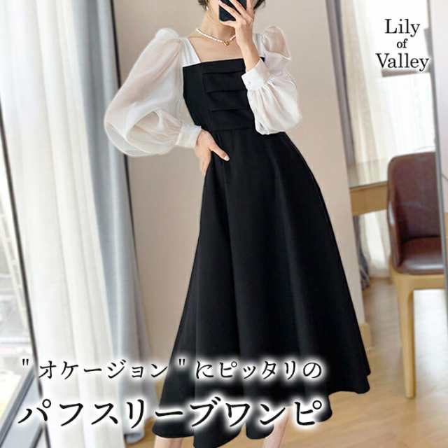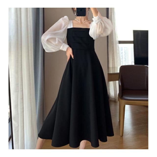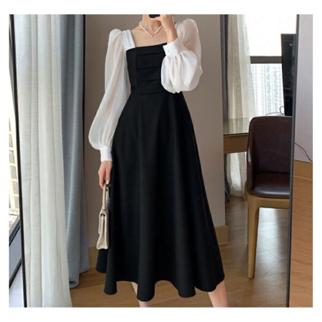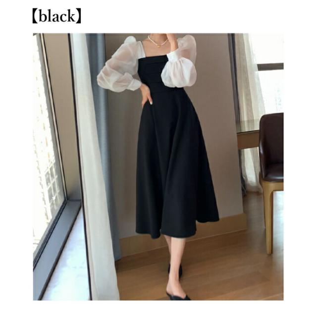 パフスリーブ ハイウエスト ワンピース ドレス 清楚 上品 きれいめ 長袖 結婚式 二次会 / レディース パーティー スクエアネック Aライン フレア ボリューム袖 お呼ばれ シフォン ミディアム丈 大きいサイズ 膝下 韓国 黒 白 ホワイト ブラック 秋冬 春夏