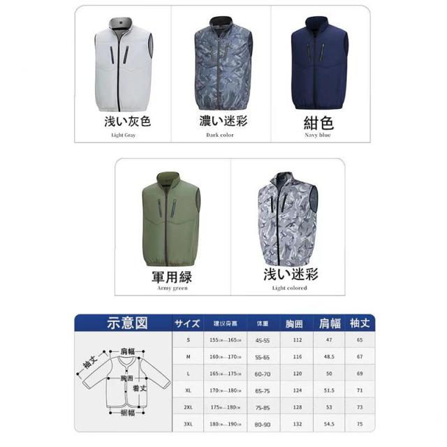 空調作業服 メンズ レディース兼用 空調作業服はファッショナブルなデザインで、男女問わず、様々なシーンに対応できます。 工場や屋外作業など、エアコンを使用できない環境でも、この作業服をご利用いただくことで、快適にお過ごしいただけるようになります。 真夏に裾のスピンドルをしっかりと閉め、ファンを回すと、服の内部はまるで極寒のクーラーのような涼しさになります!涼しい夏をお過ごしいただけることでしょう!