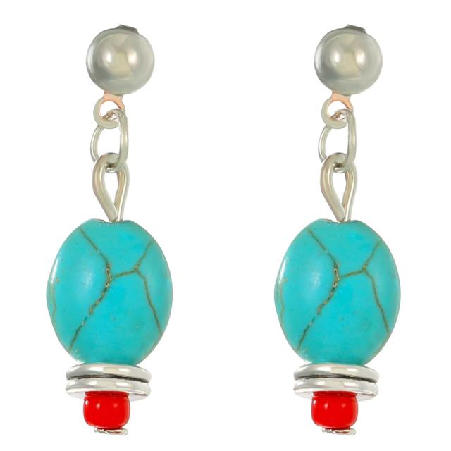 ターコイズラウンドレッドビーズスタッドピアス/1ペア トルコ石 12月 誕生石 ボヘミアン メンズ レディース インディアンジュエリー 天然石 揺れる アンティークシルバー 銀色 真鍮 ファッションピアス 両耳 プレゼント ギフト 丸型 オーバル型 赤色