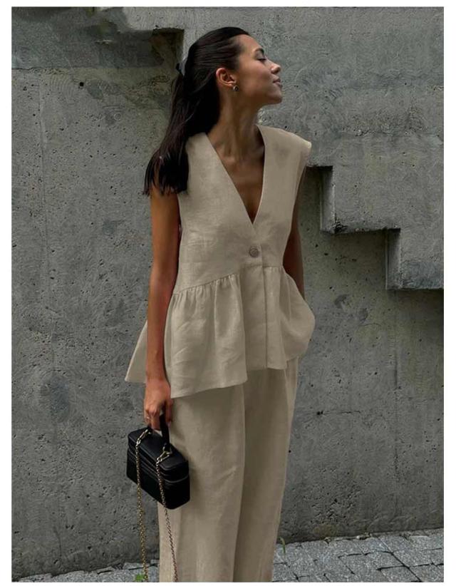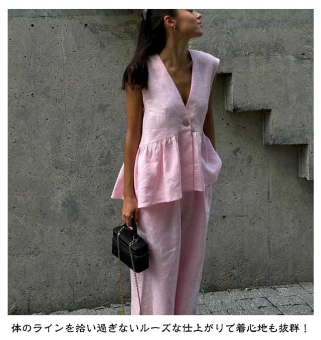 夏 40代 仕事 スーツ ノースリーブ セクシー 深Vネック ペプラム ジレベスト パンツスーツ フレアジレベスト レディース OL 体型カバー 上下セット 会社 セットアップ 結婚式 入学式 卒業式