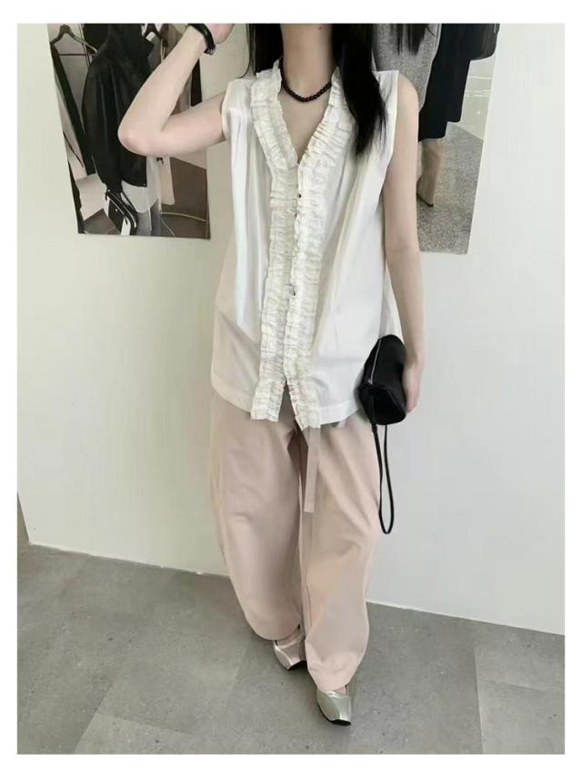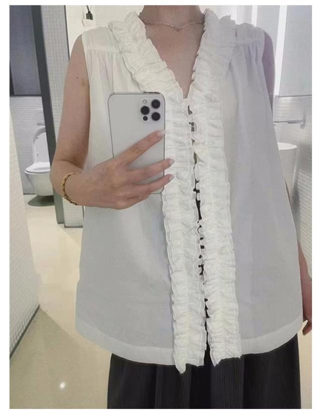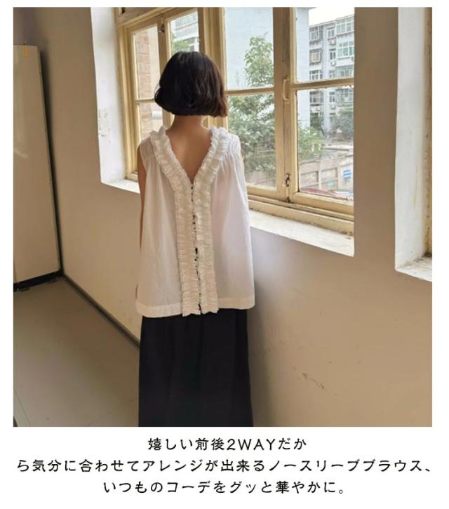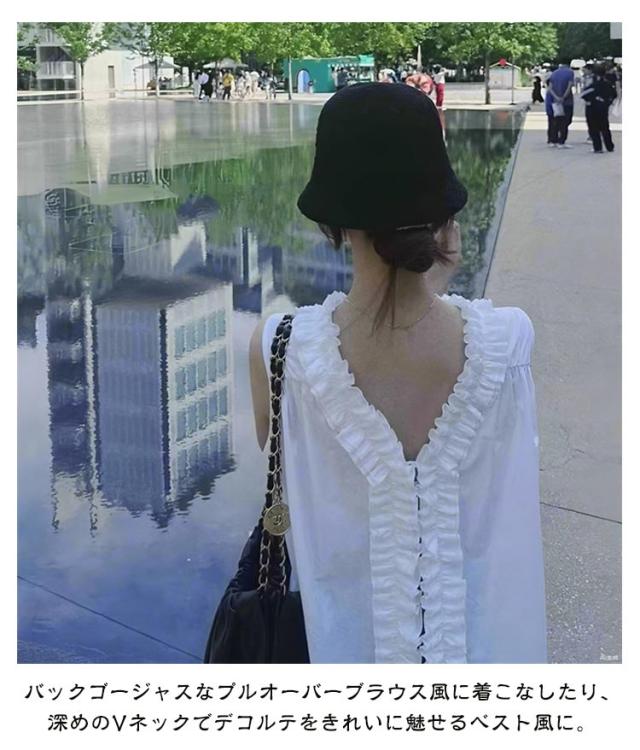 ギャザーフリル Vネック ベスト 前後2way トップス ブラウス 袖なし Vネック レディース ノースリーブシャツ 春夏新作 たっぷりフリルで華やかに クルーネック ノースリーブ 2WAY ノースリーブブラウス