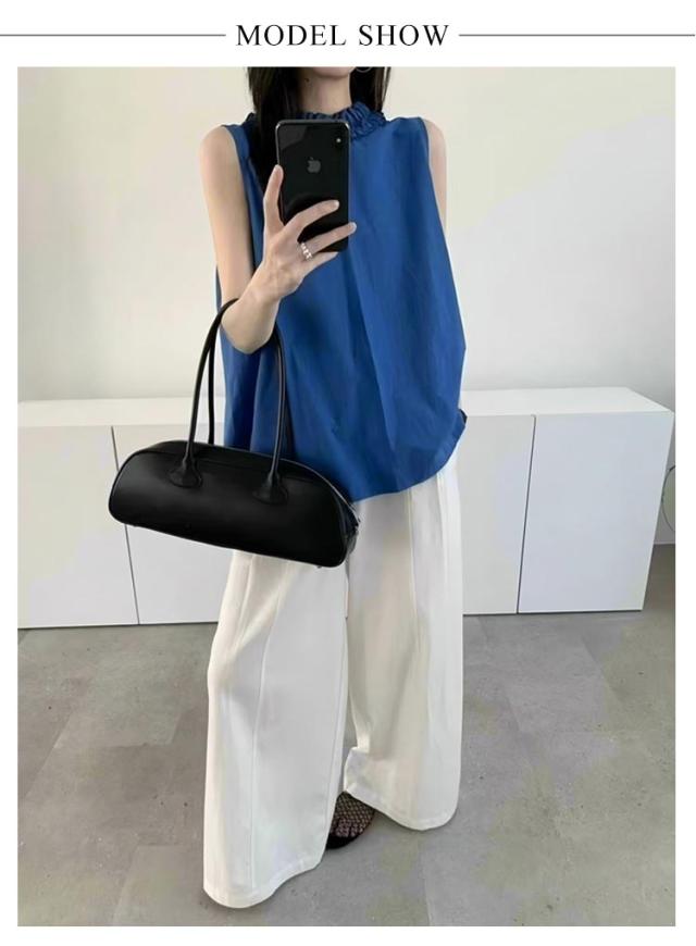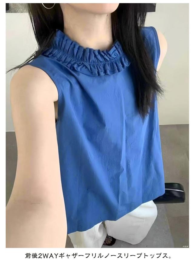 前後2way Vネック Vネック ノースリーブシャツ トップス ベスト ノースリーブ ブラウス レディース 袖なし 春夏新作 たっぷりフリルで華やかに クルーネック ギャザーフリル 2WAY ノースリーブブラウス