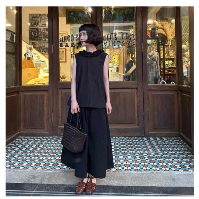 | 前後2WAYギャザーフリルノースリーブトップス。 たっぷりとギャザーフリルをあしらった華やかな1枚。 バックゴージャスなプルオーバーブラウス風に着こなしたり、深めのVネックでデコルテをきれいに魅せるベスト風に。 嬉しい前後2WAYだから気分に合わせてアレンジが出来るノースリーブブラウス、いつものコーデをグッと華やかに。 肌ざわり優しいコットン素材で、これからの季節に快適な着心地を叶える。 | |