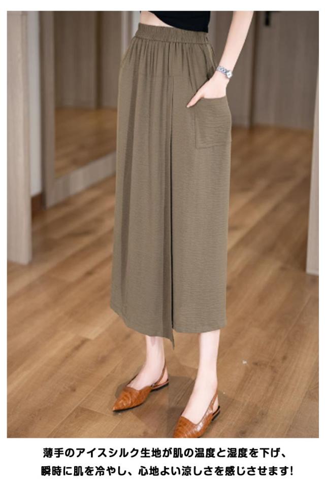 | 冷感 8分丈ガウチョパンツ スカートのようなズボンは着た瞬間、下半身のぜい肉を隠して5kgやせて見えるんです 薄手のアイスシルク生地が肌の温度と湿度を下げ、瞬時に肌を冷やし、心地よい涼しさを感じさせます! ゆったりした作りでボデイラインを強調しすぎず、体型カバーしてくれて着痩せる効果が期待できます。 痩せ見え、体型を美しく演出する動きやすく、快適な履き心地を実現。 | |