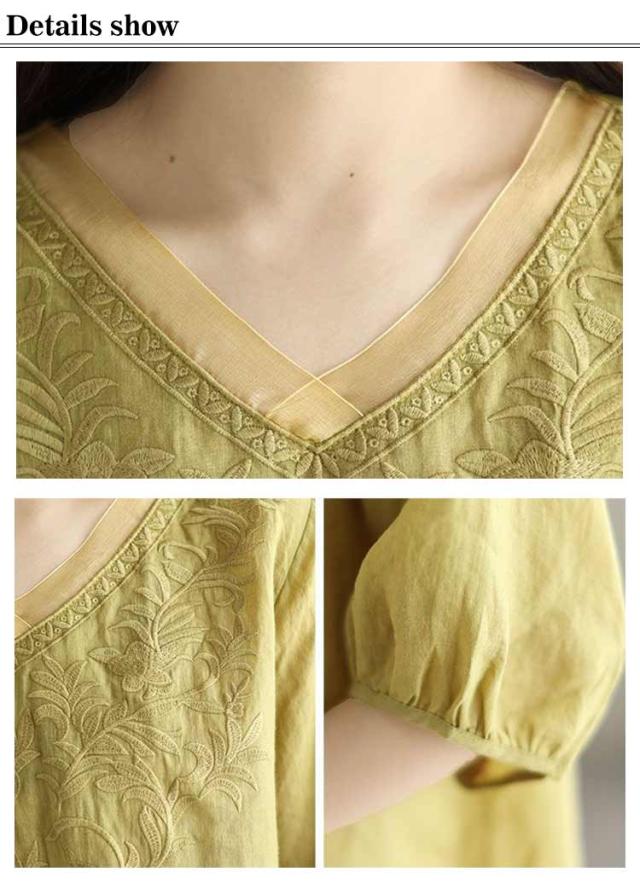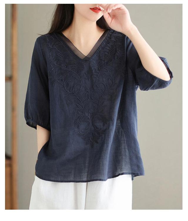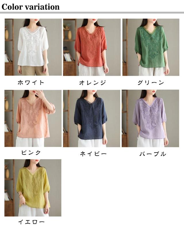 レディース ブラウス Tシャツ 半袖 きれいめ 春 刺繍 夏 Vネック チュール ゆったり 綿麻 トップス 体型カバー ブラウス 大きいサイズ 大人 おしゃれ シンプル カジュアル