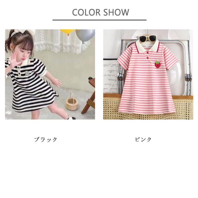 くま柄 キッズ 薄手ポロシャツドレス 夏用 Aライン子供服 カジュアル 半袖 スクール風ワンピース いちご柄 女の子 通気性良い ゆったりワンピ 柔らか ボタン開閉式襟 軽量 ポロワンピース おしゃれ プレゼント