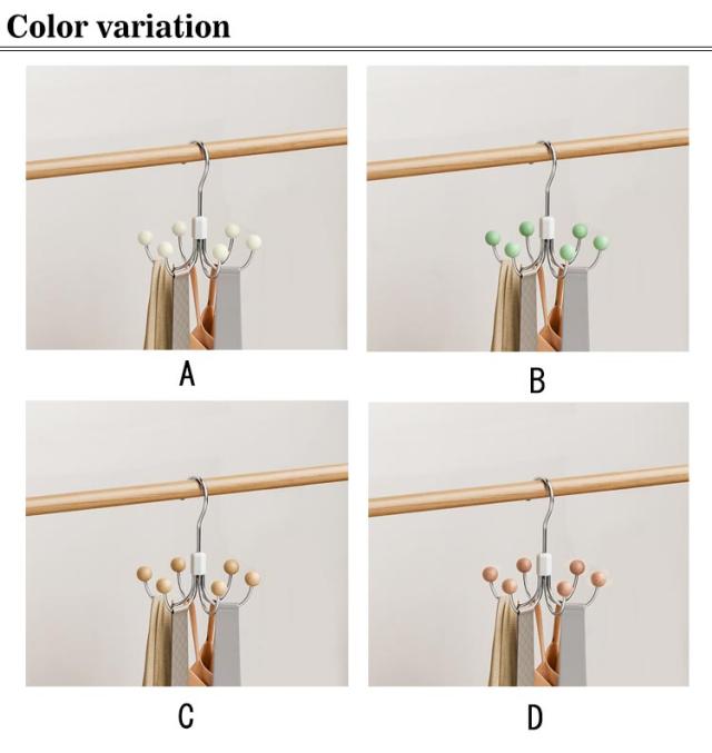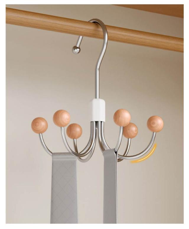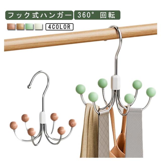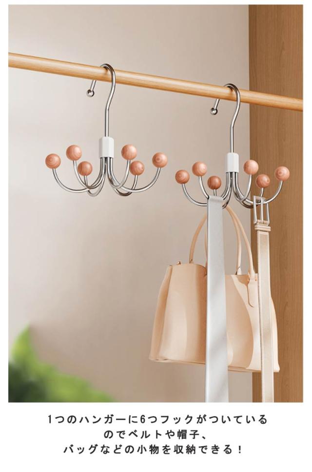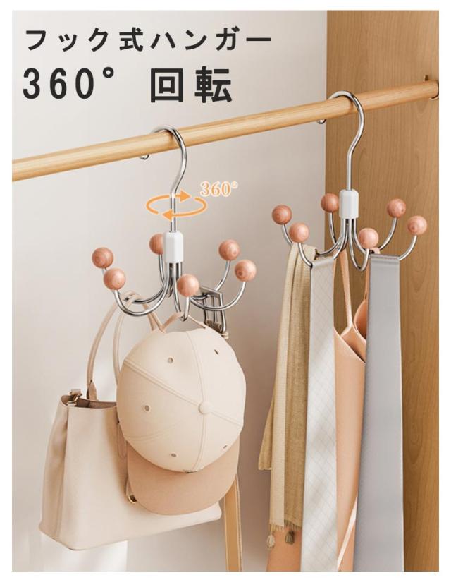 | フック式ハンガー 360°回転 1つのハンガーに6つフックがついているのでベルトや帽子、バッグなどの小物を収納できる! 360°回転式のフックで、掛けた物が取り出しやすいです。 | |