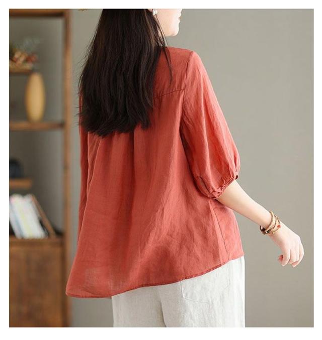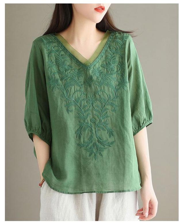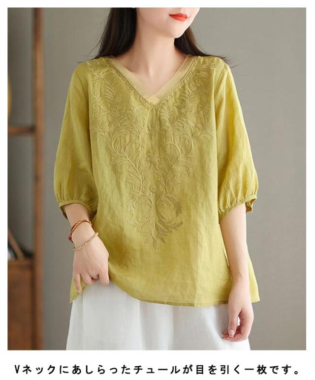 Tシャツ 夏 体型カバー 刺繍 春 レディース チュール 半袖 ゆったり ブラウス 綿麻 コットン トップス Vネック きれいめ 大きいサイズ 大人 おしゃれ シンプル カジュアル