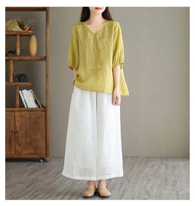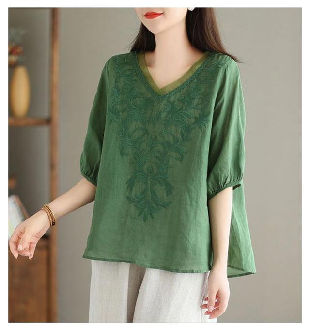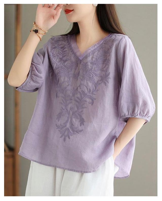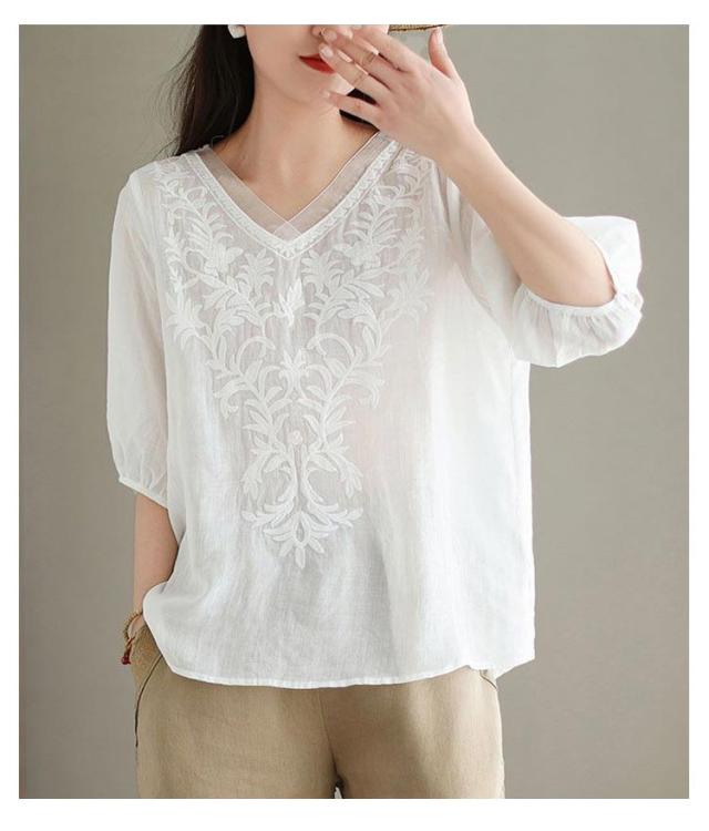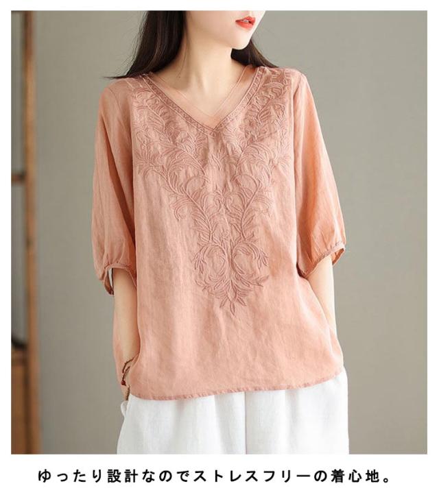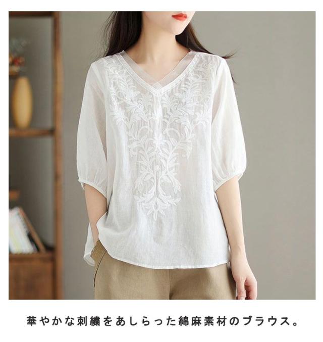 夏 ブラウス 綿麻 ブラウス 刺繍 ゆったり 春 半袖 Vネック チュール 大人 Tシャツ トップス 体型カバー きれいめ 大きいサイズ コットン おしゃれ シンプル カジュアル