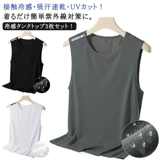 涼しい 3枚セット インナーシャツ メンズ ひんやり 3枚セット タンクトップ 吸汗速乾 ノースリーブ 接触冷感 袖なしTシャツ UVカット トレーニングウェア ランニング ジム 運動着 爽快 通気 涼感 スポーツウェア