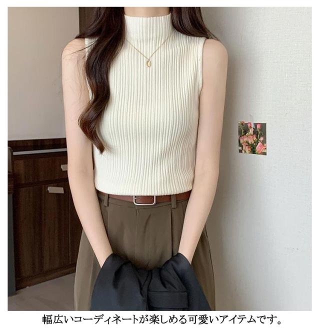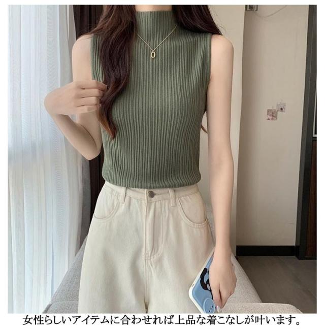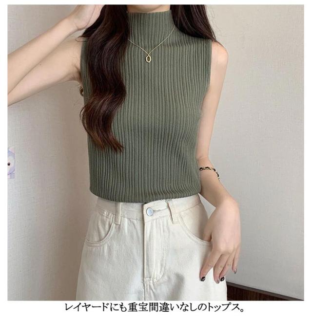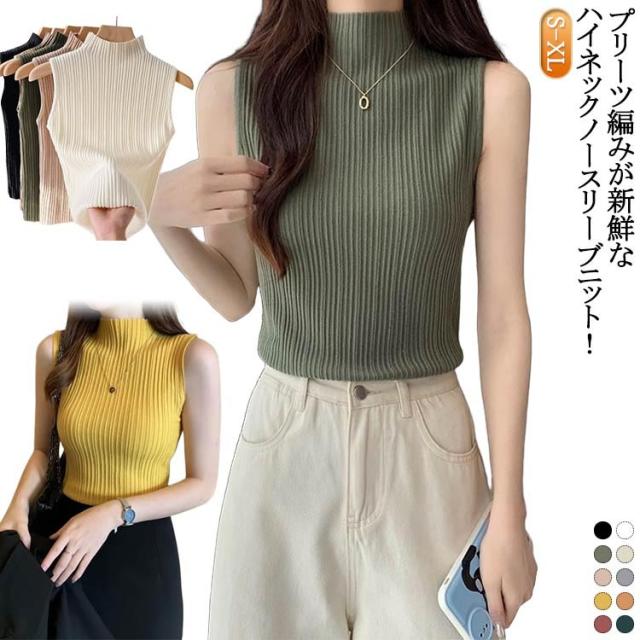 ストレッチ ハイネックニット ハイネック ノースリーブ タンクトップ ニット サマーニット ニットトップス インナー Tシャツ トップス 春夏 レイヤード 袖なし 大きいサイズ プリーツ シンプル 無地 L S M ニットトップス XL