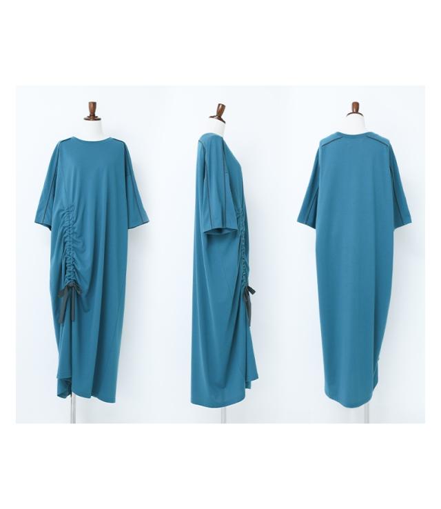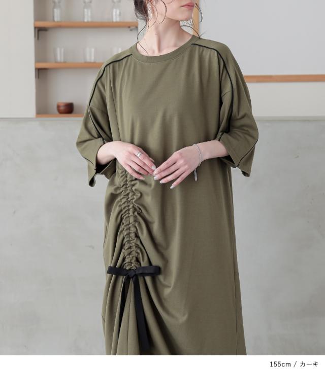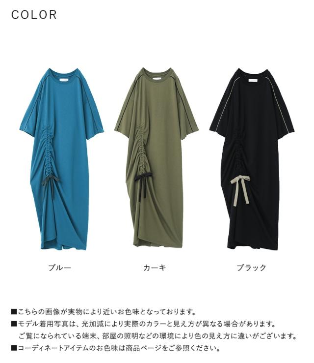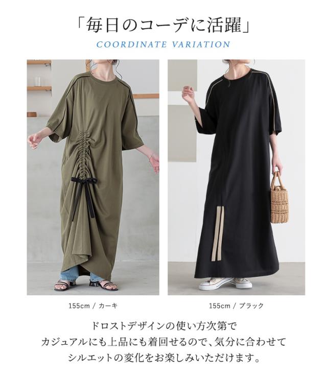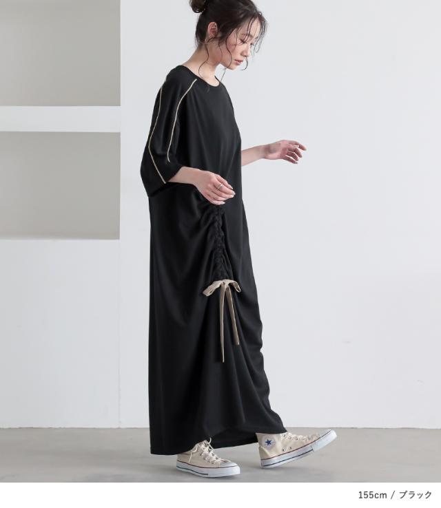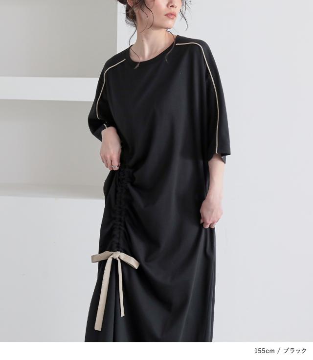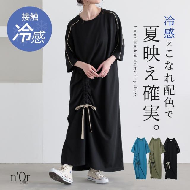 23日最大1200円クーポン 『接触冷感配色ドロストワンピース』【メール便不可】【20】[ワンピース レディース ドレス ロング丈 半袖 接触冷感 パイピング ドロスト 配色 クルーネック 二の腕カバー 春 夏]