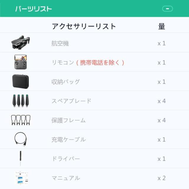 航空機*1、リモコン*1、USB充電ケーブル*1、ドライバー*1、保護ラック*4、電池*1、風葉*4、収納ボックス* 1