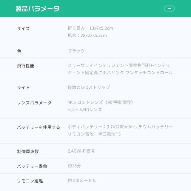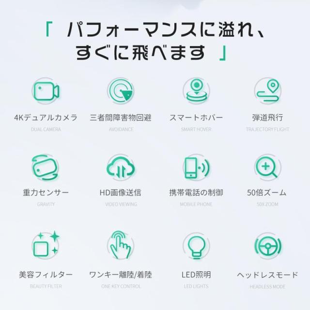 リアルタイム、高度維持、写真/録画、ワンキー離陸/着陸、モード切替、トリム調整、ヘッドレスモード