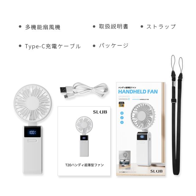 扇風機本体、充電用Type-Cケーブル、ストラップ、取扱説明書。