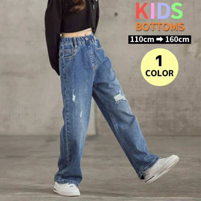 デニムパンツ キッズ ダメージ ジーンズ ワイド デニム パンツ 子供 子ども ジュニア ジーパン ウエストゴム 穴あき ストレート ボトムス 女の子 男の子 ガールズ ゆったり おしゃれ 可愛い アメカジ 小学生 中学生 110 120 130 140 150 160cm