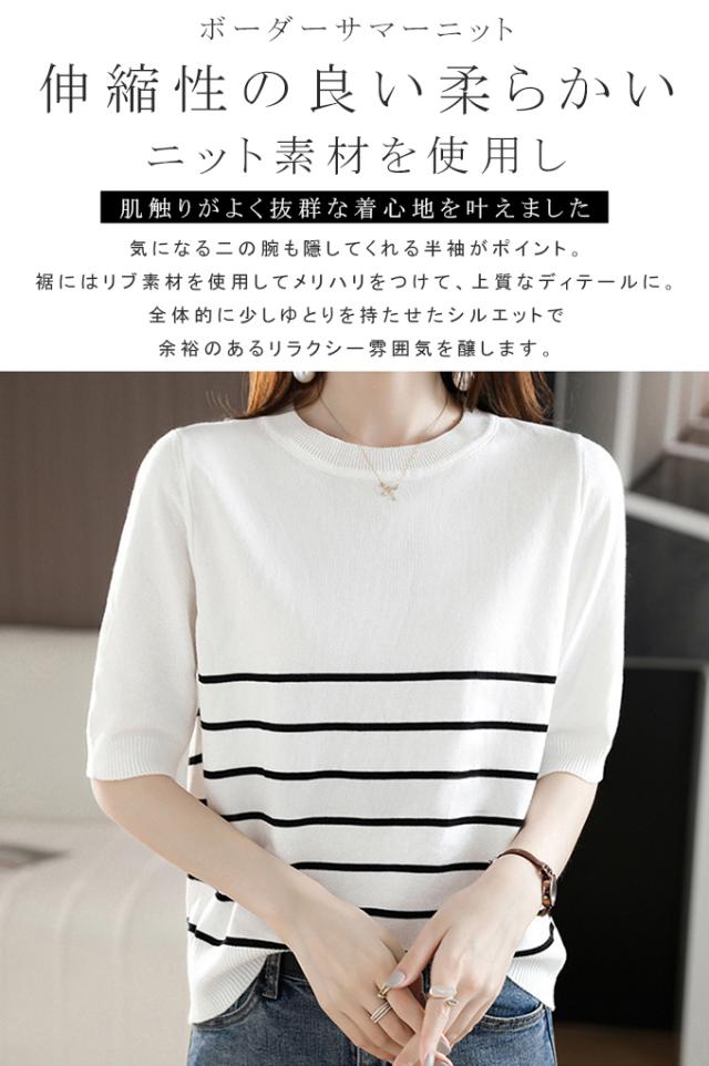 ボーダーサマーニット 伸縮性の良い柔らかいニット素材を使用し、肌触りがよく抜群な着心地を叶えました。 気になる二の腕も隱してくれる半袖がポイント。 裾にはリブ素材を使用してメリハリをつけて、上質なディテールに。 全体的に少しゆとりを持たせたシルエットで、余裕のあるリラクシー雰囲気を醸します。 ※モニター環境により多少色合いが異なりますので、予めご了承くださいませ。 |