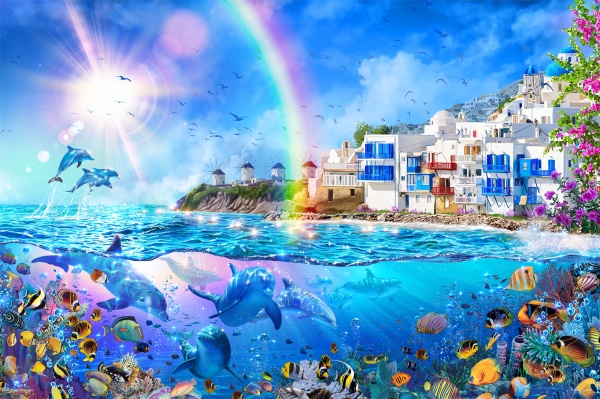透き通る海の中には優雅に泳ぐイルカの姿があり、地中海の美しさと生命の躍動が感じられるアートに仕上がっています。