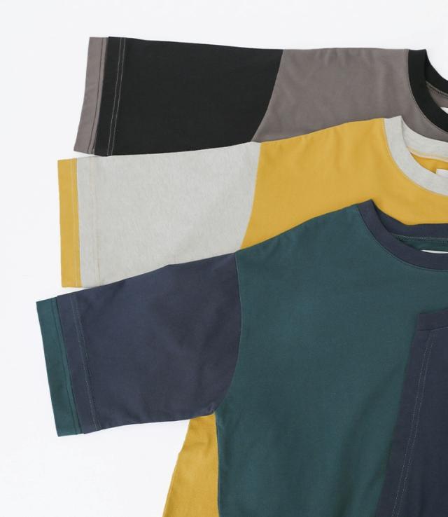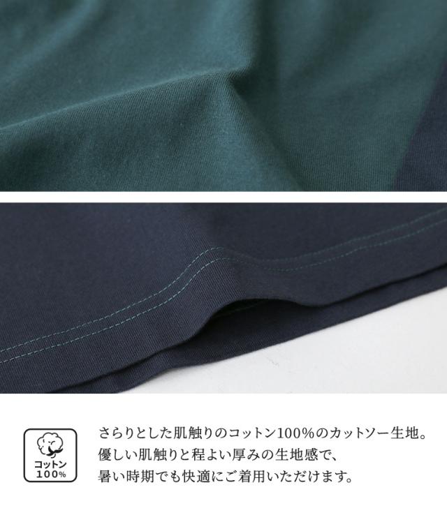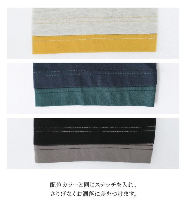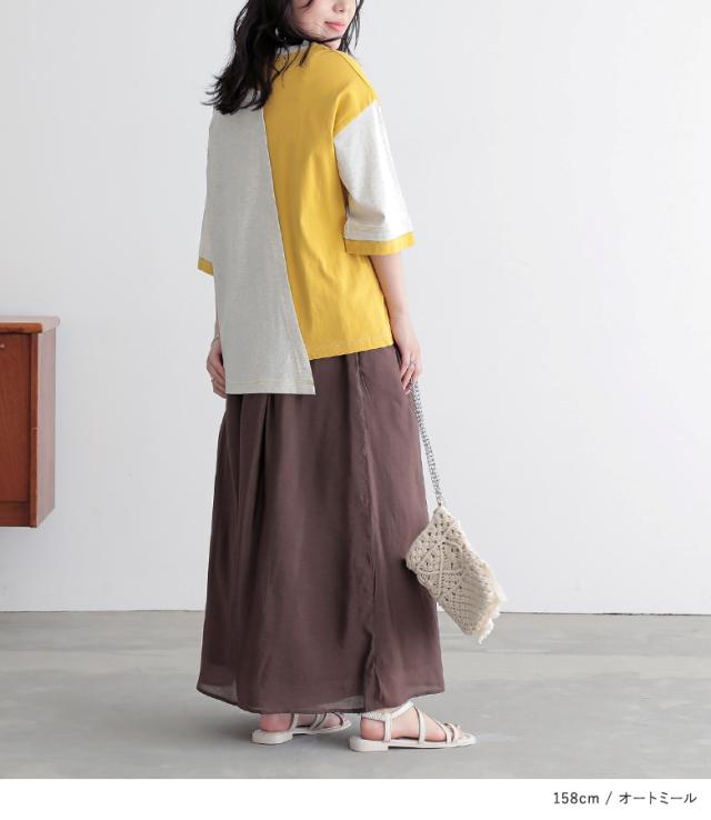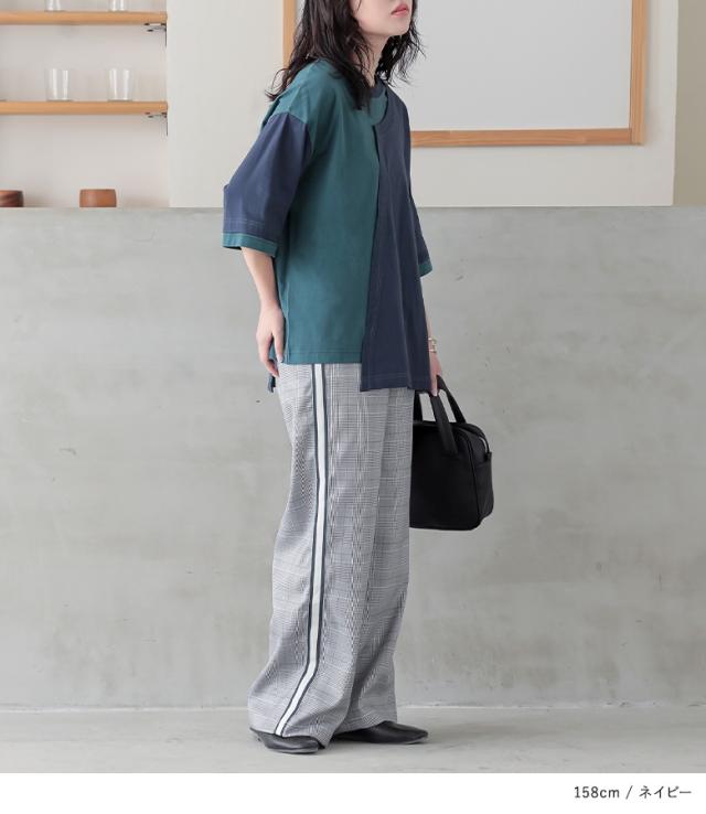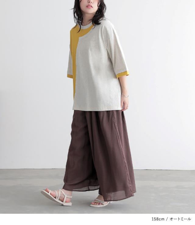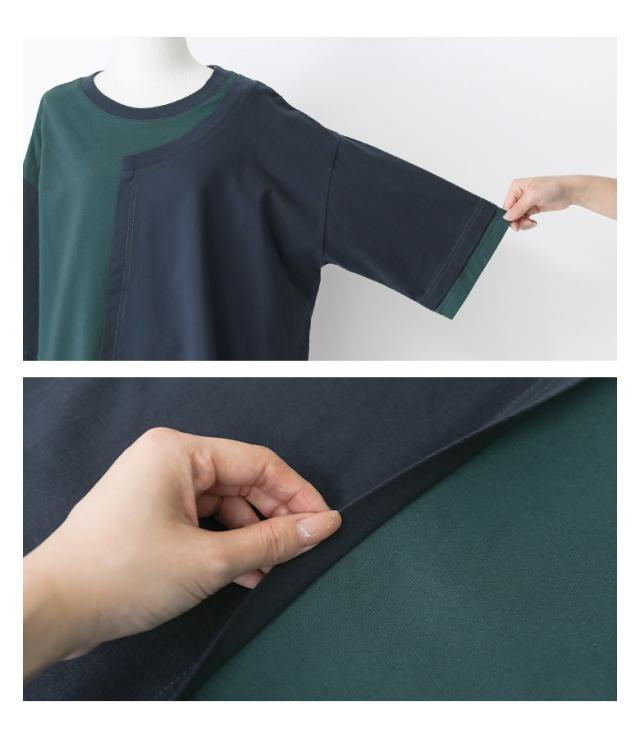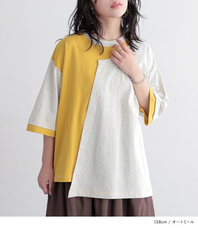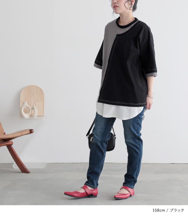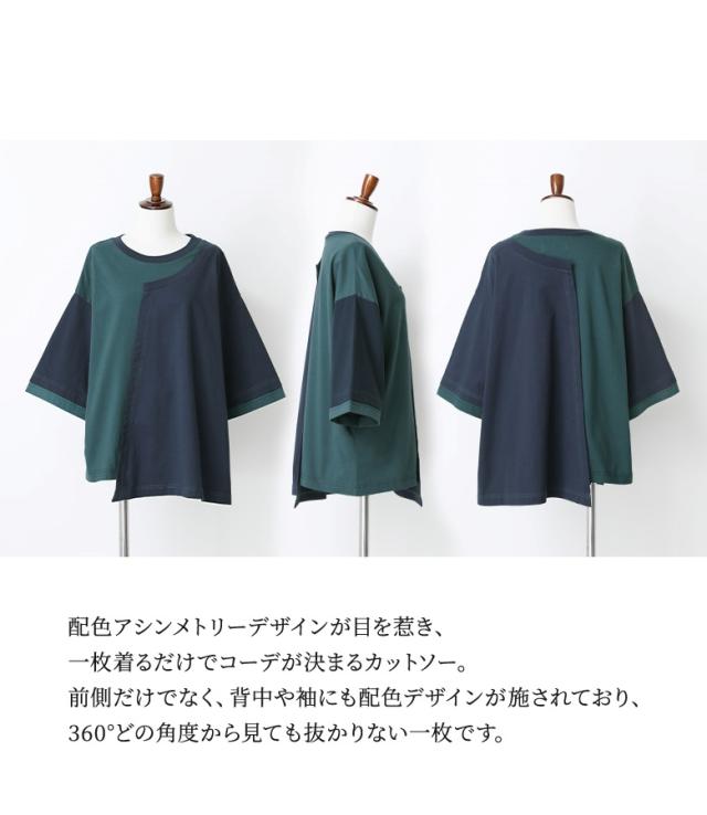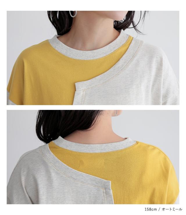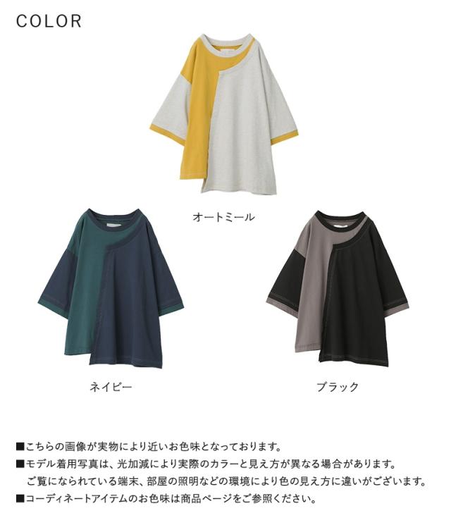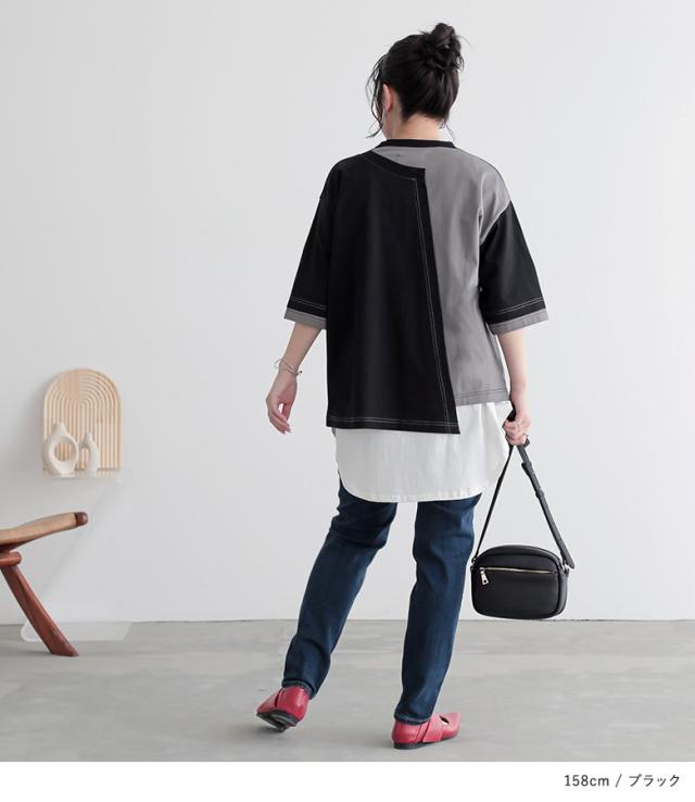 『配色アシメ切替カットソー』※メール便可※【10】[カットソー レディース トップス 半袖 五分袖 コットン100% 綿100% アシンメトリー アシメ クルーネック 重ね着 レイヤード 夏]