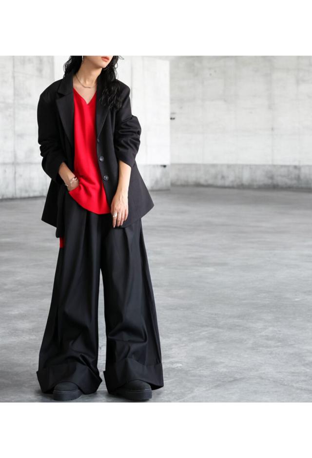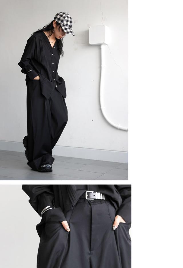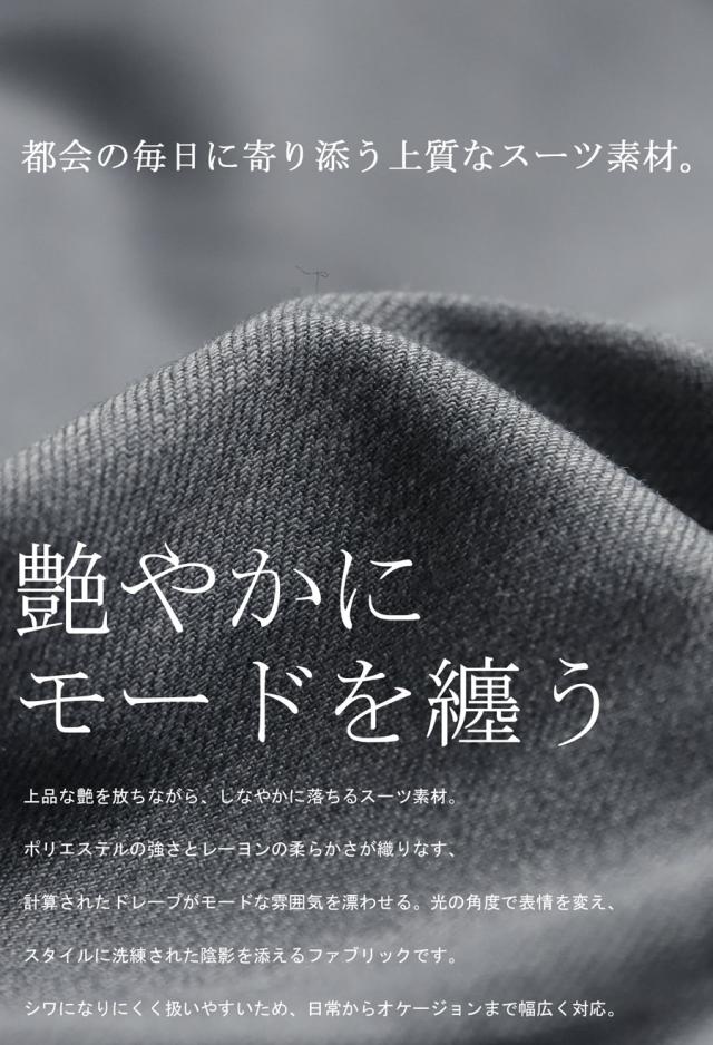 ポリエステル×レーヨン混で程よい落ち感があり、モード感を高めつつ着心地の良さにも配慮しています。