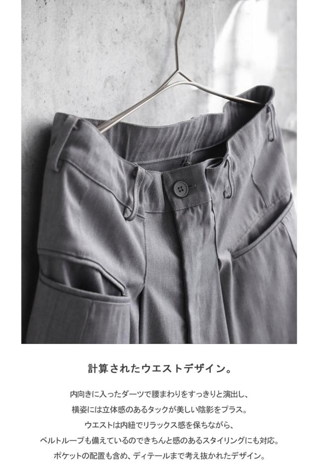 ヒップラインまで美しく見せるダーツ入りで、横姿もどこか女性らしい雰囲気に。