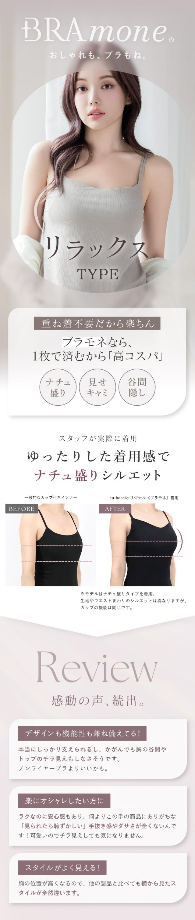 tu-hacci Inner Collection ブラトップ単品 リブキャミソール接触冷感リラックスタイプ 「ナチュラルに盛りたい」「バストの形を綺麗に見せたい」 「でも、暑さや汗の不快感は軽減したい」 そんな“でも”にまで応える主役級カップ付きキャミソールが tu-hacciの人気No.1インナーに仲間入り! おしゃれも美胸も快適も、これ1枚で叶える。 夏に大活躍間違いなしの自信作です。 【こんな方におすすめ】 ・汗やニオイが気になる方 ・少しでも涼しく快適に過ごしたい方 ・ノンワイヤー派だけどバストの形が崩れるのが心配 ・窮屈な下着、ワイヤーの締め付けが苦手 ・バストボリュームが少なくカップ上部がパカパカしやすい ・自然な盛り感でバストをきれいに見せたい ・大きいサイズのカップ付きインナーが欲しい ■夏の暑さ対策に!汗やニオイも一緒にケア ・吸水速乾加工で汗をかきやすい季節にも◎ ・接触冷感で快適な着心地 ・メッシュ素材のカップ裏で通気性抜群 ・消臭加工生地で気になる汗の臭い対策も ■楽!なのに『バスト位置UP』 ・ノンワイヤーでノンストレス ・ゆったりリラックスシルエットで涼しい ・「ナチュ盛り」を叶える下厚パッド搭載 ・背中まで搭載したパワーネットで、脇肉までしっかりホールド ■私サイズが見つかる ・豊富なサイズ展開 ・自分好みのフィット感に調節可能なアジャスター付き ■夏のおしゃれの主役にも ・下着に見えにくいツイン肩紐とリブ素材 ・トレンド感のあるデザインと重ね着に困らないベーシックなカラー ≫ ギフトラッピングはこちら ≪ | |