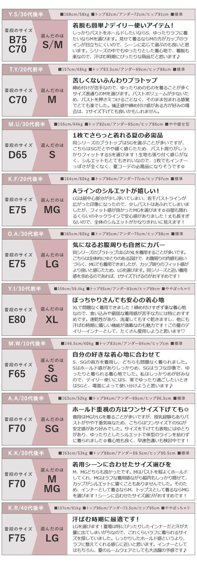| S:A65 B65 C65 SG:D65 E65 F65 M:A70 B70 C70 MG:D70 E70 F70 L:A75 B75 C75 LG:D75 E75 F75 XL:C80 D80 E80 ※対応サイズは目安となり、実際の着用感には個人差がございます。 |