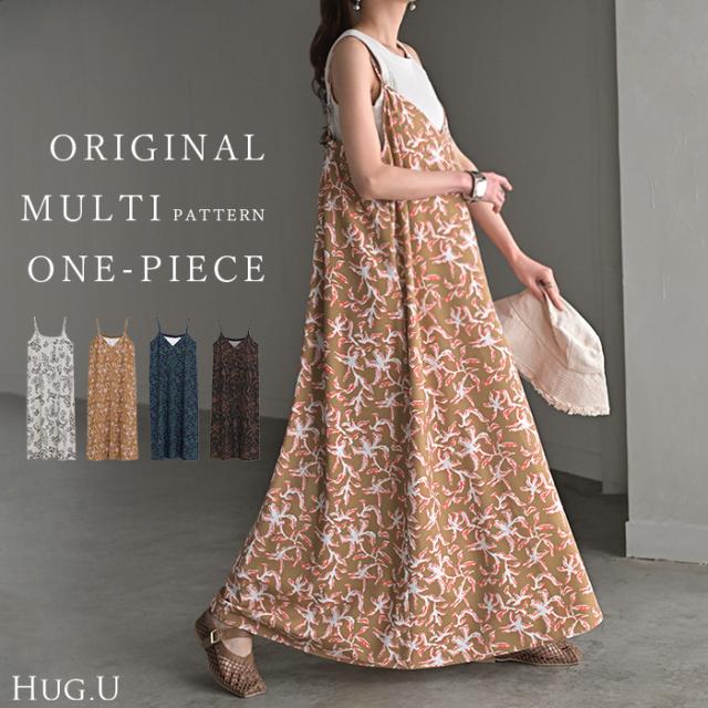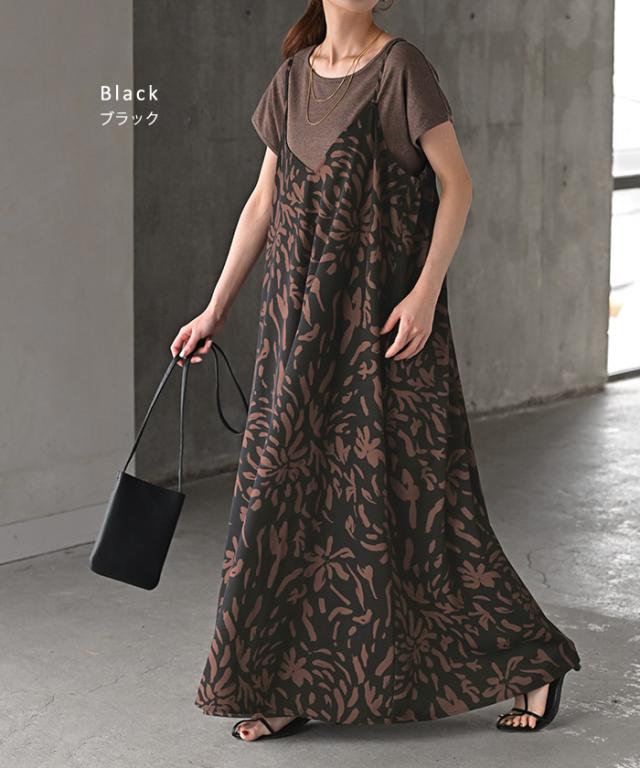 ワンピース 柄 ロング ワンピ キャミワンピ レディース キャミソールワンピース ロングワンピース Aライン マキシ マキシワンピース ロングワンピ ノースリーブ タンクトップ レイヤード 体型カバー 大きいサイズ 総柄 アート 黒 春 夏 HUG.U
