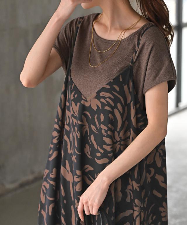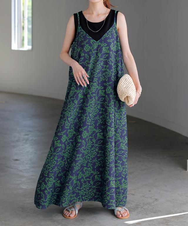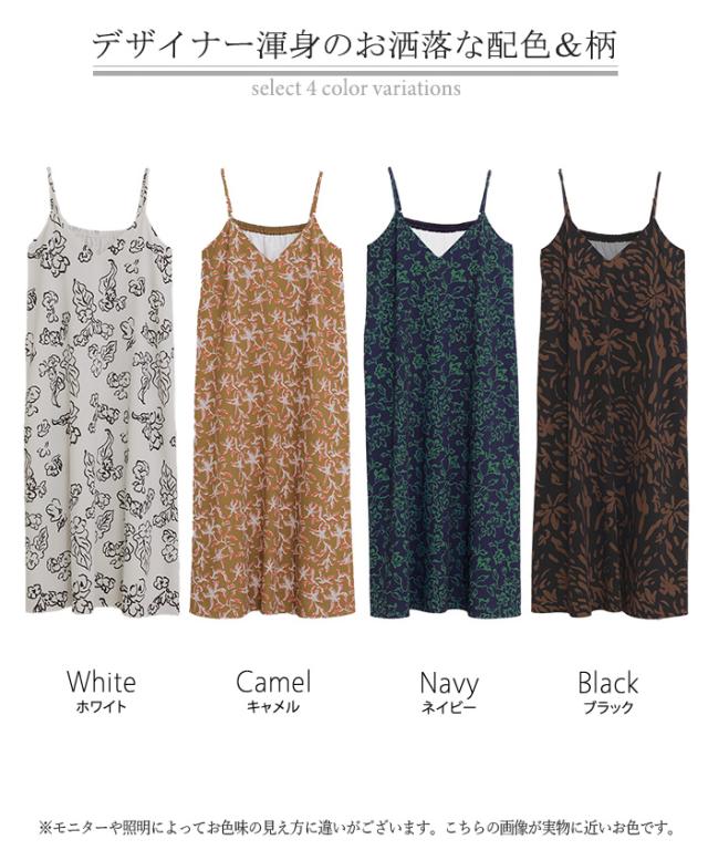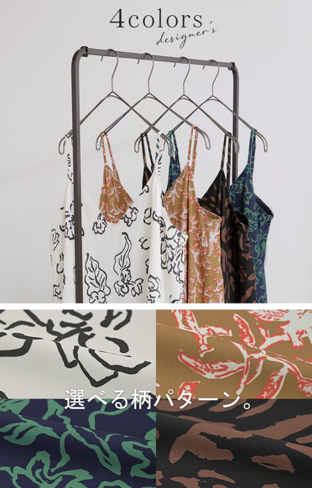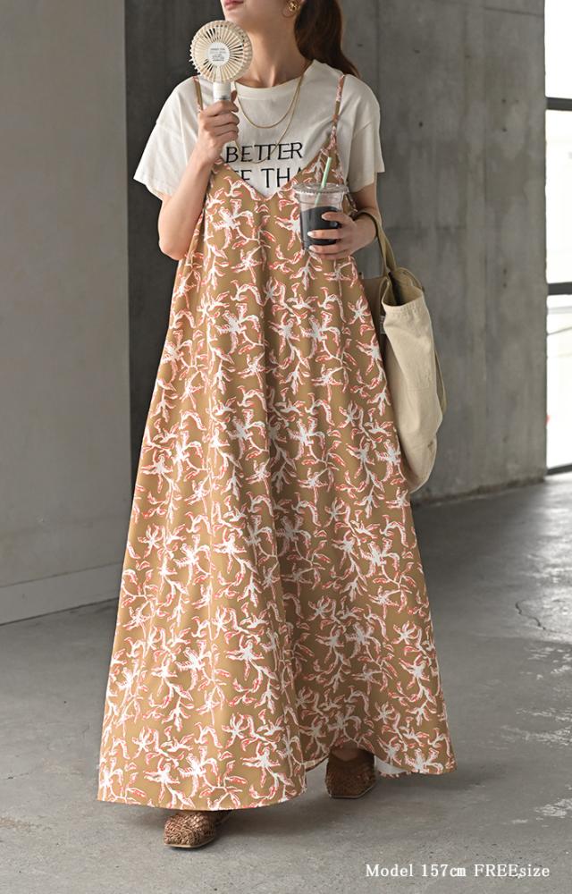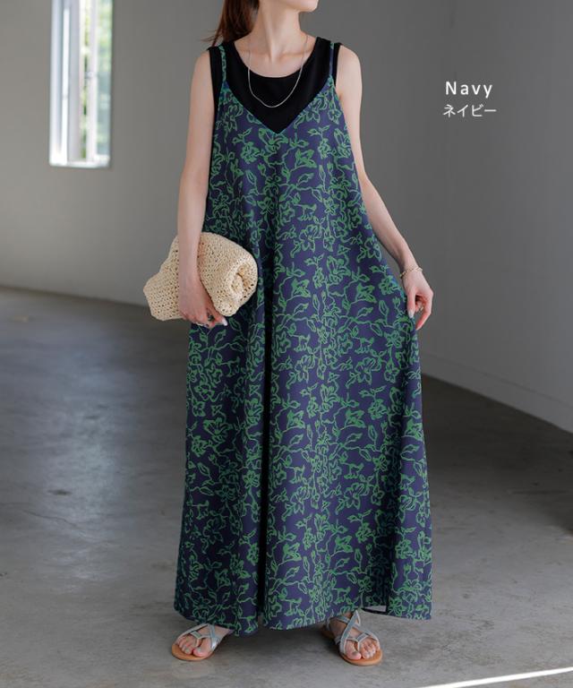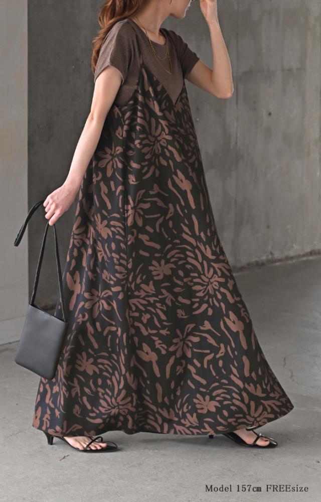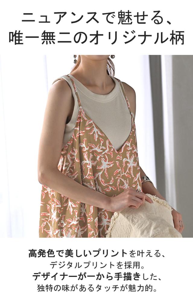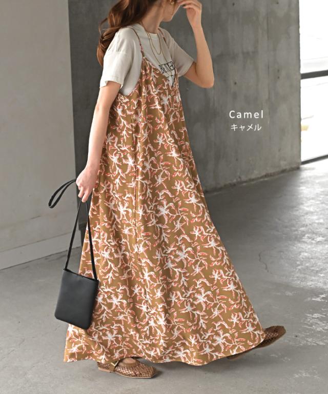 ニュアンスある総柄がアクセント加えてくれるキャミソールワンピースです。