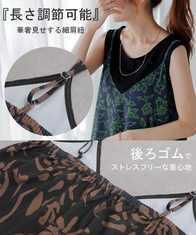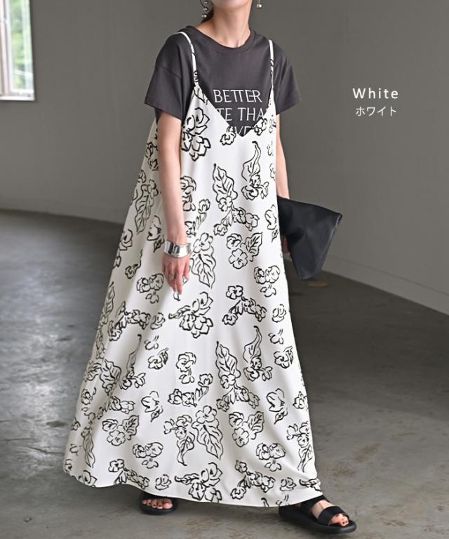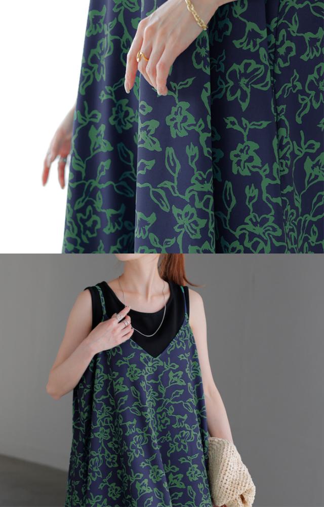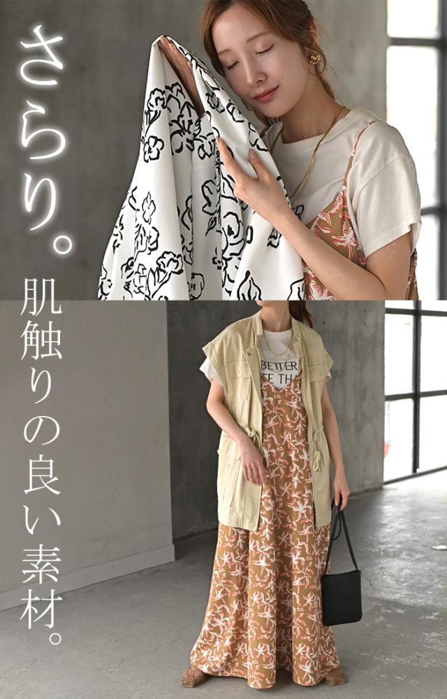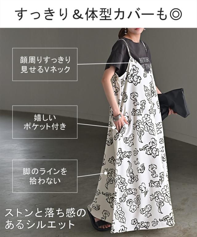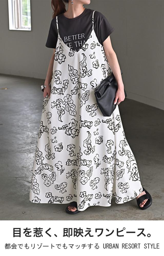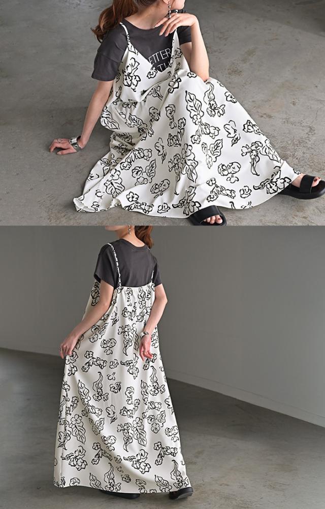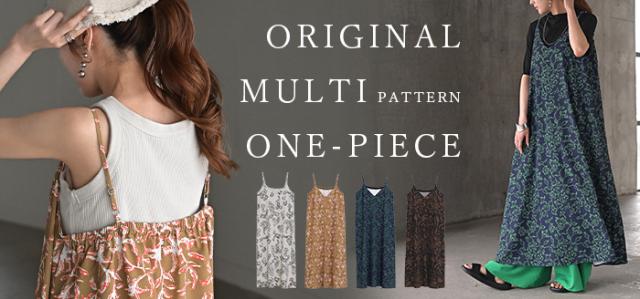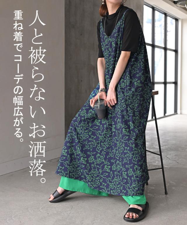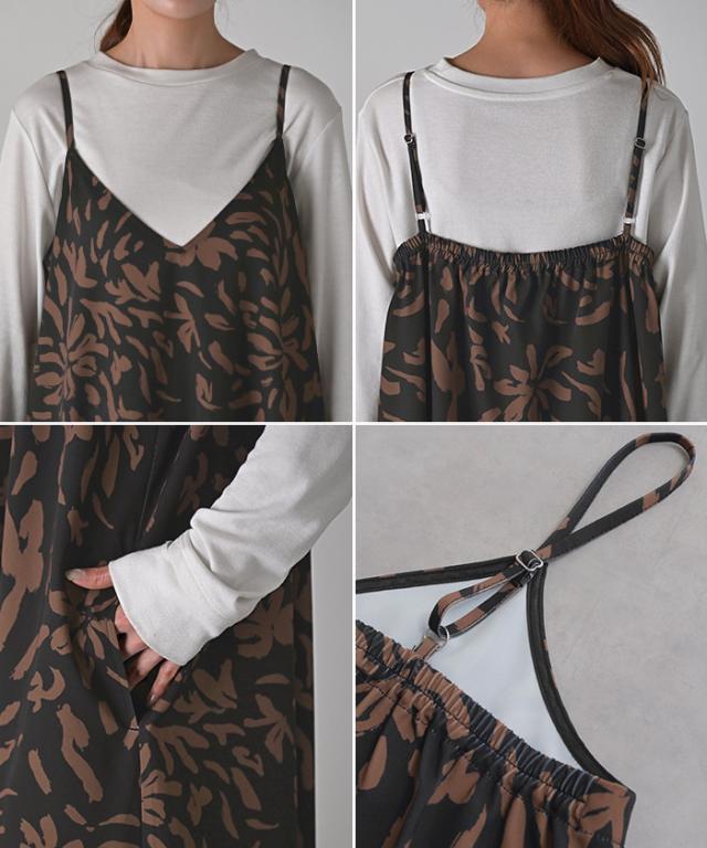 ニュアンスある総柄がアクセント加えてくれるキャミソールワンピースです。