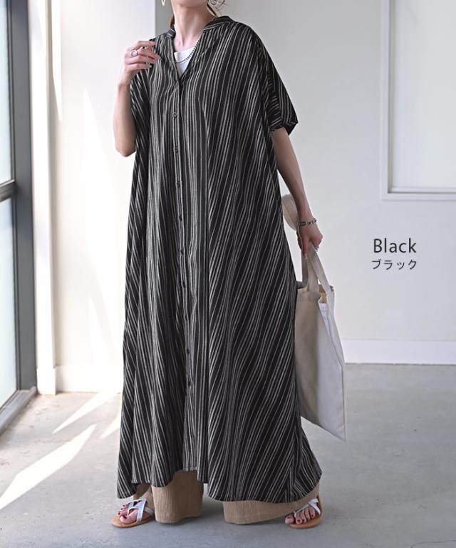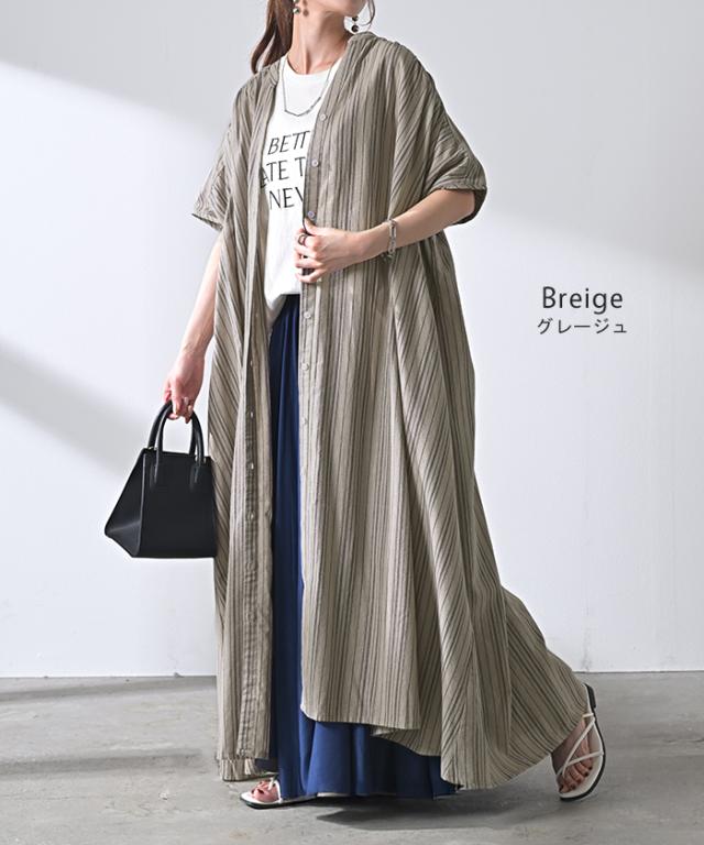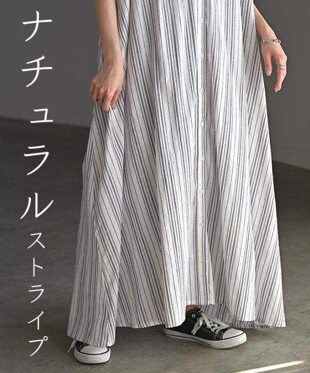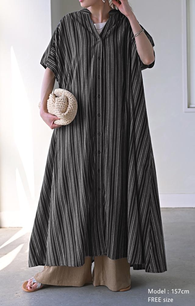 ワンピース ストライプ シャツ リネン 混 一部4月下旬入荷 キーネック シャツワンピース シャツワンピ レディース ロング ロングワンピース マキシ マキシワンピース ワンピ ロングシャツ ロングワンピ ノーカラ— 半袖 羽織 ナチュラル 体型カバー 黒 春 夏 HUG.U 秋新作