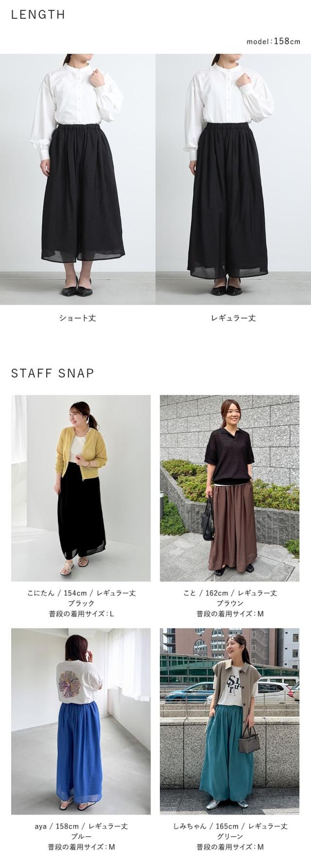 | staff:W/164cm B84 W68 H96.5 【普段着用】 Tops: M Bottoms: M/L | 【フリーサイズ】 着丈(ショート丈):ふくらはぎ真ん中くらい 着丈(レギュラー丈):かかと上1cm位 ウエスト:ゆったり ヒップ:ゆったり 太もも周り:ゆったり 全体:ゆったり ゆったり穿けました。 |