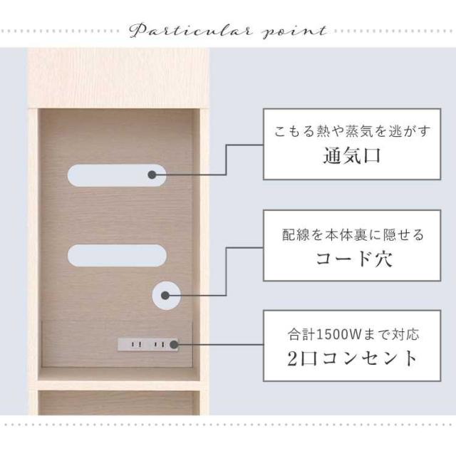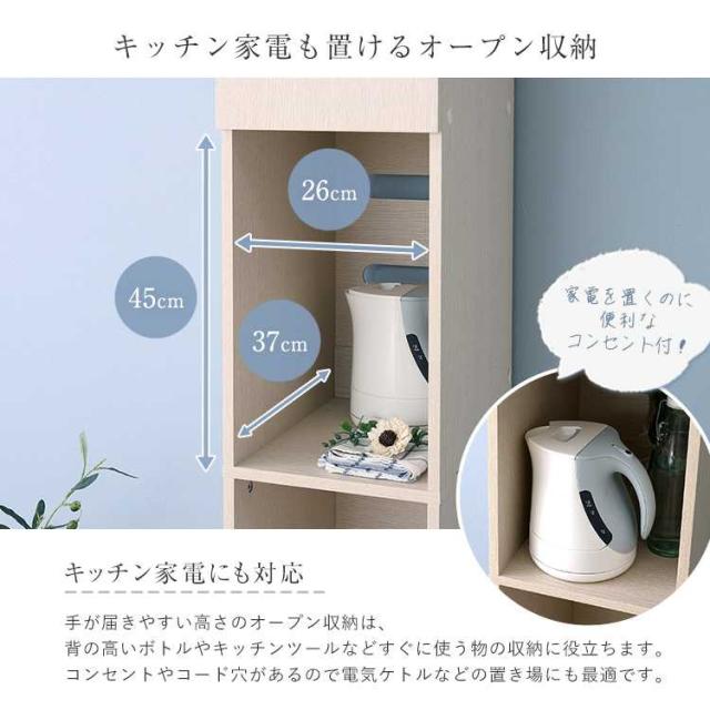 上部は扉収納とオープン収納がある為、食器や家電などをスマートに収納できます。