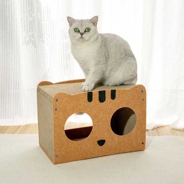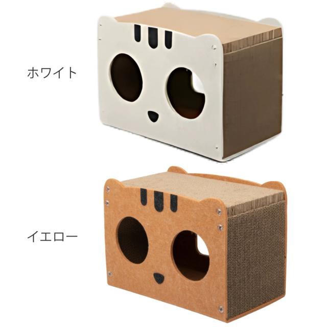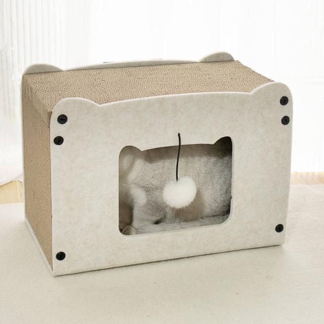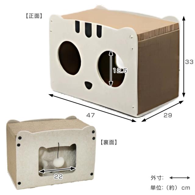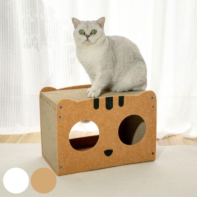 上部と側面は段ボール、全面と背面はフェルトで作られておりハウス全面で爪とぎが楽しめます。どちらも耐久性のある高密度の素材を使用しており、思いっきり爪とぎが可能です。ソファやカーペットでの爪とぎを好む布派の猫ちゃんにもぴったりです。