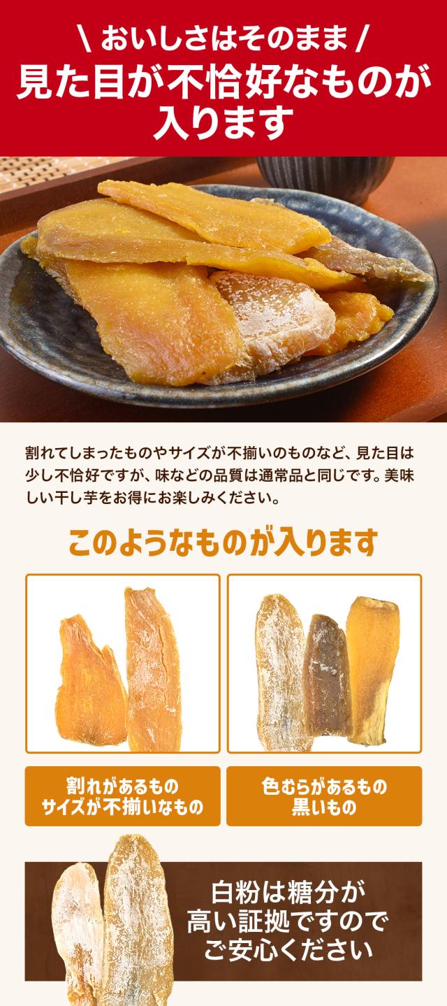 当店大注目の一品!!自然の甘さが広がる訳あり干し芋です。こちらの商品は、【形・大きさが不揃い】【色むらがある】【味や色・硬さが異なる】ものが含まれます。伝統的な製法で作られた真心のこもった干し芋です。訳ありであることを感じさせない味わい。一度はお手に取っていただきたい商品です。