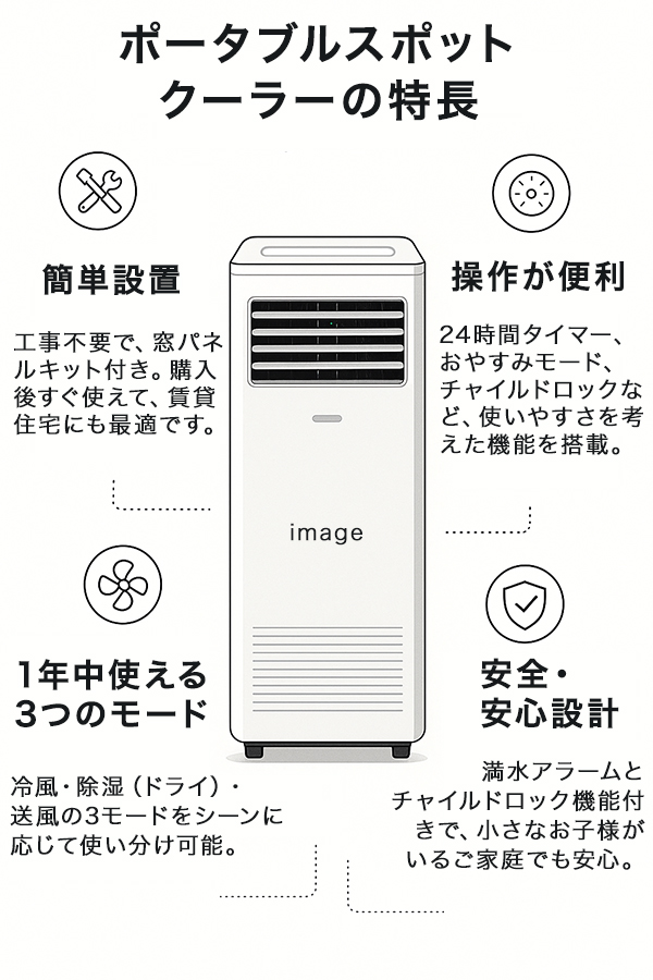 工事不要で今すぐ涼しさを手に入れる!賃貸でも使える移動式クーラー 今年の夏も猛暑の予感…そんな中、エアコン設置ができない賃貸住宅にお住まいの方や、 部分的に冷やしたい場所がある方に朗報です! 窓パネル付きのポータブルスポットクーラーは、工事不要で今すぐ使える本格冷房機器。 コンセントに差し込み、付属の窓パネルを取り付けるだけで、すぐに涼しい空間が実現します。 \ポータブルスポットクーラーのここがポイント/ ■工事不要で簡単設置 窓パネルセット付きで購入後すぐに使えるため、賃貸住宅でも気軽に冷房環境が整えられます。 ■多機能で便利な操作性 24時間タイマーやおやすみモード、チャイルドロックなど、使い勝手を考えた機能が充実しています。 ■3モード搭載で用途に合わせて使い分け 冷風・ドライ(除湿)・送風の3モードを状況に応じて選べるので、一年中活躍します。 ■安心・安全の機能性 満水時のアラーム通知やチャイルドロック機能で、小さなお子様がいるご家庭でも安心してお使いいただけます 【こんな人におすすめ】 ■賃貸や団地など、エアコン工事ができない住まいの方 ■子ども部屋・寝室・書斎など“部分冷房”をしたい方 ■電気代を抑えて夏を快適に乗り切りたい節電志向の方 ■キャンプや車中泊などアウトドアシーンで活躍するクーラーを探している方 ■熱中症対策を万全にしたいファミリーや高齢者世帯 【工事いらず】届いてすぐに冷房空間が手に入る 最大の特徴は、**「エアコン工事が不要」**な点。 排気ホースと窓パネルがセットになっており、工具なしであっという間に設置できます。 これがどれだけありがたいか、特に賃貸住まいの方なら身にしみてわかるはず。 2. 【3モード×タイマー×ロック】多機能で1年中使える! この一台には「冷風」「ドライ(除湿)」「送風」の3モードが搭載されており、 夏場以外でも活躍。24時間オンオフタイマーやチャイルドロック機能も標準装備。 除湿能力はなんと1日約16.8L。ジメジメ対策にも心強い存在です。 ズバリこのモデルが優位な理由は「冷房性能 × 安全性 × 操作性」の三拍子が揃っていること。 他の簡易冷風機と比べて“家電クラス”の風量・除湿力が得られる点が決定的な差です。 ■使用レビュー:寝室で実際に使ってみた! 「本当に涼しいの?」「音はうるさくない?」そんな疑問をもとに、寝苦しい熱帯夜にスタッフが検証! 就寝前にタイマー設定をしておけば、おやすみモードで音も控えめに運転。 室温が下がって入眠がスムーズに。日中は書斎でスポット冷房に使ったが、リモコン操作で風量も簡単に調整でき、PC作業も快適。 リビングで全体を冷やすというより「この空間だけ今すぐ冷やしたい」時に、抜群に効きます。 【スタッフVoice】 驚くべきはその「即効性と設置の手軽さ」。賃貸住宅や子ども部屋でも、たった数分で快適空間に早変わり。 まるで“持ち運べるエアコン”。しかも除湿機能が高性能で、梅雨時期にも活躍する点は見逃せない。 惜しい点は、排水タンク容量が0.43Lとやや小さめなため、除湿モードではこまめな排水が必要なこと。 ただ、それを差し引いてもこの使い勝手は魅力的ですね。 【商品特徴・キーワード】 ポータブルクーラー 工事不要 窓パネル付き スポットクーラー 移動式エアコン 省エネ コンパクト 冷風機 除湿機能付き クーラー 寝室用 静音クーラー 賃貸 エアコン代替 【製品仕様】 ■サイズ・重量 本体サイズ:約幅330×高さ685×奥行280mm 本体重量:約19500g ■生産地:中国 ■素材:ABS、銅、スチール、アルミニウム ■電気仕様 電源:AC100V 50/60Hz ■定格消費電力:650W/50Hz 750W/60Hz 電源コードの長さ:約1.8m ■冷房能力 冷房能力:1.7kW/50Hz 2.0kW/60Hz ■最大ドライ(除湿)能力:約16.8L/日(500mlペットボトル33本分) 風量:2段階調節(弱・強) ■運転モード:冷風/ドライ/送風 冷媒:R410A/260g ■タイマー機能 タイマー:オン/オフタイマー(1〜24時間:1時間単位) ■その他仕様 騒音:≦65dBA(条件 冷風モード 風量:強) ■排水タンク容量:0.43L(※除湿時はこまめな排水が必要)L リモコン電源:単4形マンガン電池×2(別売り) ■排気ホース:約φ154×長さ240〜1500mm ドレンホース:約φ10×長さ1000mm ■保証期間:1年間 ■セット内容 本体、排気ホース、ジョイント、ドレンホース、ノズル、窓パネルセット(パネル(A・B・C各1)、 パネル固定用金具一式(固定金具、ワッシャー、蝶ナット各2)、リモコン、取扱説明書 【注意事項】 ●使用時は、電源プラグをコンセントにしっかりと奥まで差し込む。 ●電源コード、電源プラグの破損、損傷がないかを確認する。 ●電源プラグの刃(先端)や刃の根本に埃がついている場合は、きれいに拭き取る。 ●本製品は必ず接地して使用する。 ●コンセントや配線器具の定格を超える使い方や、交流100V以外では使用しない。 ●分解、修理、改造をしない。 ●電源コードを無理に曲げたり、引っ張ったり、ねじったりしない、束ねたりしない、重い物を載せたりしない。 ●電源プラグをコ