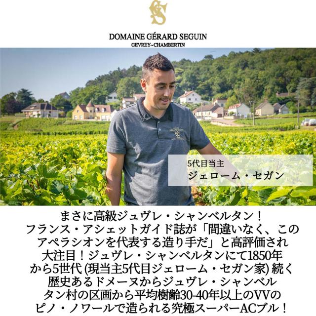 まさに高級ジュヴレ・シャンベルタン!フランス・アシェットガイド誌が「間違いなく、このアペラシオンを代表する造り手だ」と高評価され大注目!ジュヴレ・シャンベルタンにて1850年から5世代 (現当主5代目ジェローム・セガン家) 続く歴史あるドメーヌからジュヴレ・シャンベルタン村の区画から平均樹齢30-40年以上のVVのピノ・ノワールで造られる究極スーパーACブル!