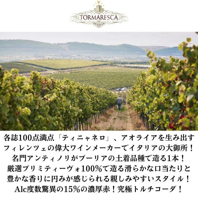 各誌100点満点「ティニャネロ」、アオライアを生み出すフィレンツェの偉大ワインメーカーでイタリアの大御所! 名門アンティノリがプーリアの土着品種で造る1本!厳選プリミティーヴォ100%で造る滑らかな口当たりと豊かな香りに円みが感じられる親しみやすいスタイル! Alc度数驚異の15%の濃厚赤!究極トルチコーダ!