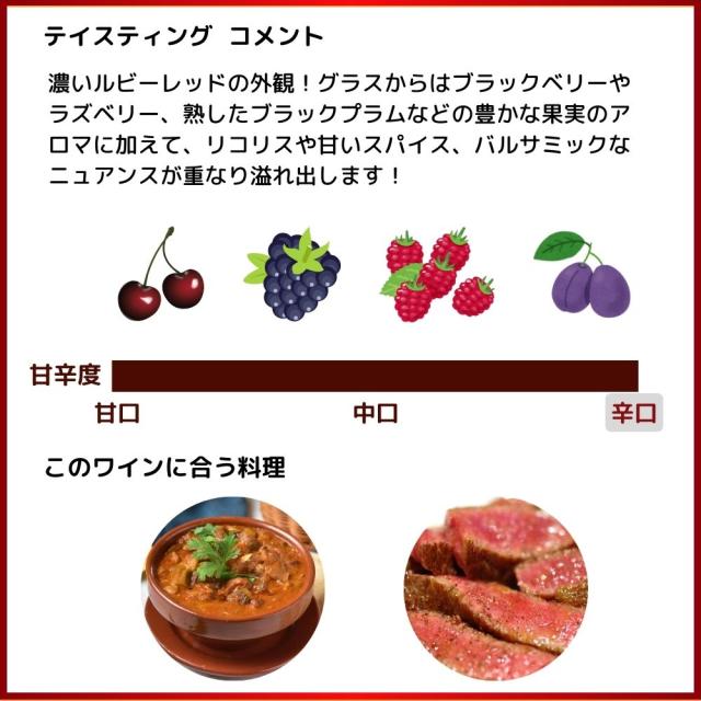 ![]() ■ぶどう品種:プリミティーヴォ ■発酵・熟成:約2週間発酵後、フランス産とハンガリー産のバリック樽主体(80%)と大樽(20%)で約10ヶ月熟成。その後、瓶熟6ヶ月 ■アルコール度数:15% イタリア辛口赤ワイン愛好家大注目!アンティノリファン大注目!名門アンティノリがプーリアの土着品種で造る1本! 濃いルビーレッドの外観!グラスからはブラックベリーやラズベリー、熟したブラックプラムなどの豊かな果実のアロマに加えて、リコリスや甘いスパイス、バルサミックなニュアンスが重なり、溢れ出します!口当たりは柔らかくおおらかで、濃密な風味を、生き生きとした酸味と繊細で張りのあるタンニンが支える、バランスの取れた味わい!甘草や月桂樹、白檀、ミネラル感を纏ったクリーミーで長い余韻へ導く、アルコール度数驚異の15%の究極フルボディ辛口赤ワイン! ステーキやビーフシチュー、牛ほほ肉の赤ワイン煮込みといったお肉料理と相性抜群!赤ワインの酸っぱさや渋みが苦手という方でもお楽しみいただける1本です! |