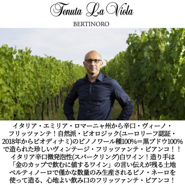 イタリア・エミリア・ロマーニャ州から辛口・ヴィーノ・フリッツァンテ!自然派・ビオロジック(ユーロリーフ認証・2018年からビオディナミ)のピノノワール種100%=黒ブドウ100%で造られた珍しいヴィンテージ・フリッツァンテ・ビアンコ!!イタリア辛口微発泡性(スパークリング)白ワイン!造り手は「金のカップで飲むに値するワイン」の言い伝えが残る土地ベルティノーロで僅かな数量のみ生産されるピノ・ネーロを使って造る、心地よい飲み口のフリッツァンテ・ビアンコ!