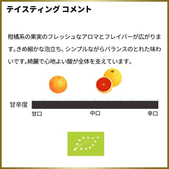 ![]() ■ぶどう品種:ピノ・ネーロ(ピノ・ノワール)種100% ■熟成:ボトリングした後、最低でも5ヶ月熟成 ■平均樹齢:20年 ■残糖:約12g/L ■収穫:手摘み ■地形:西向き ■標高:180m ■栽植密度:5,000本/ha 柑橘系の果実のフレッシュなアロマとフレイバーが広がります。きめ細かな泡立ち、シンプルながらバランスのとれた味わいです。綺麗で心地よい酸が全体を支えています。 もちろん正規品の素晴らしい状態で限定少量入荷! |